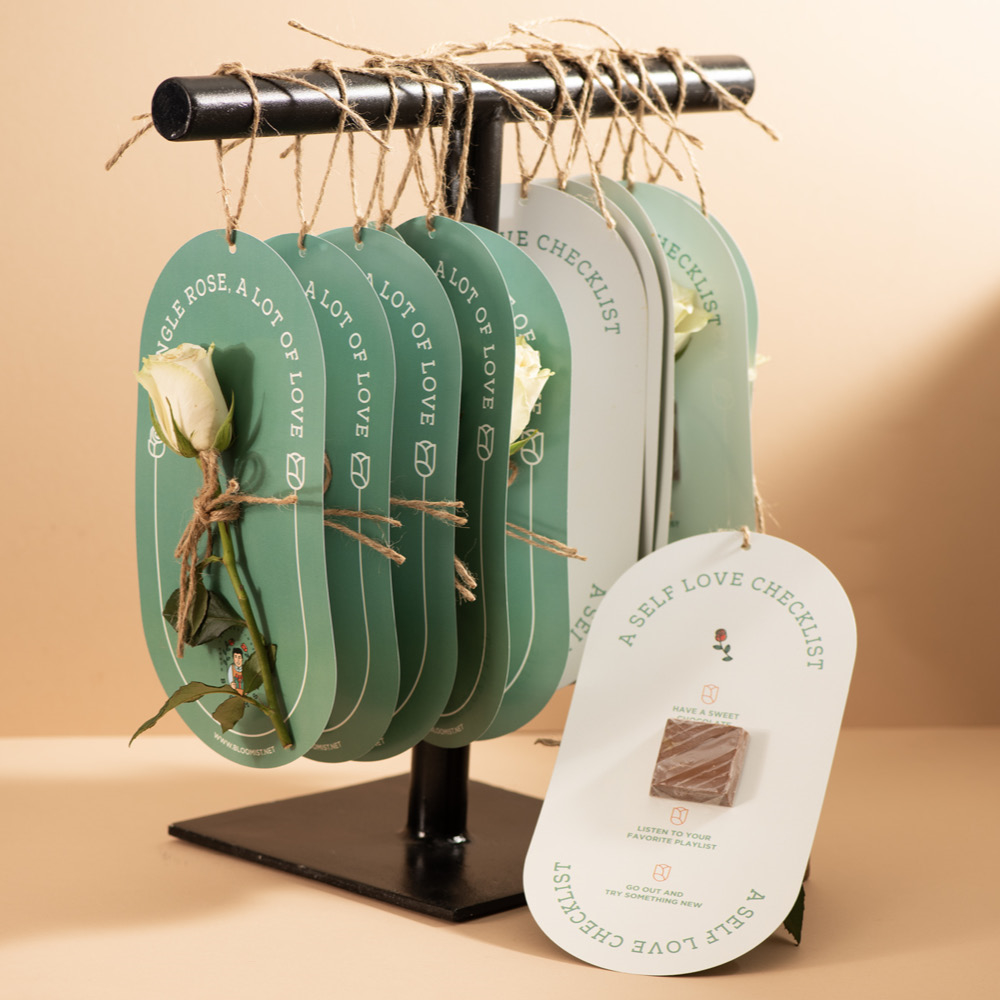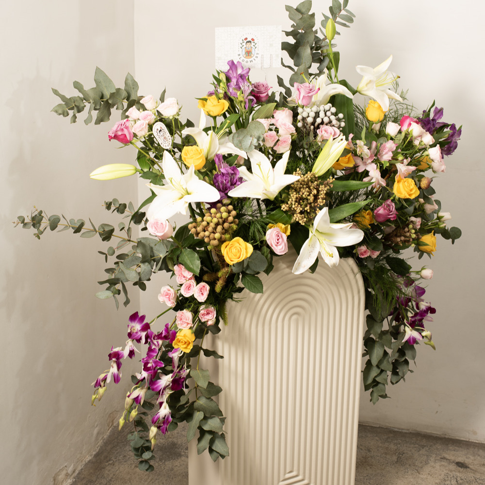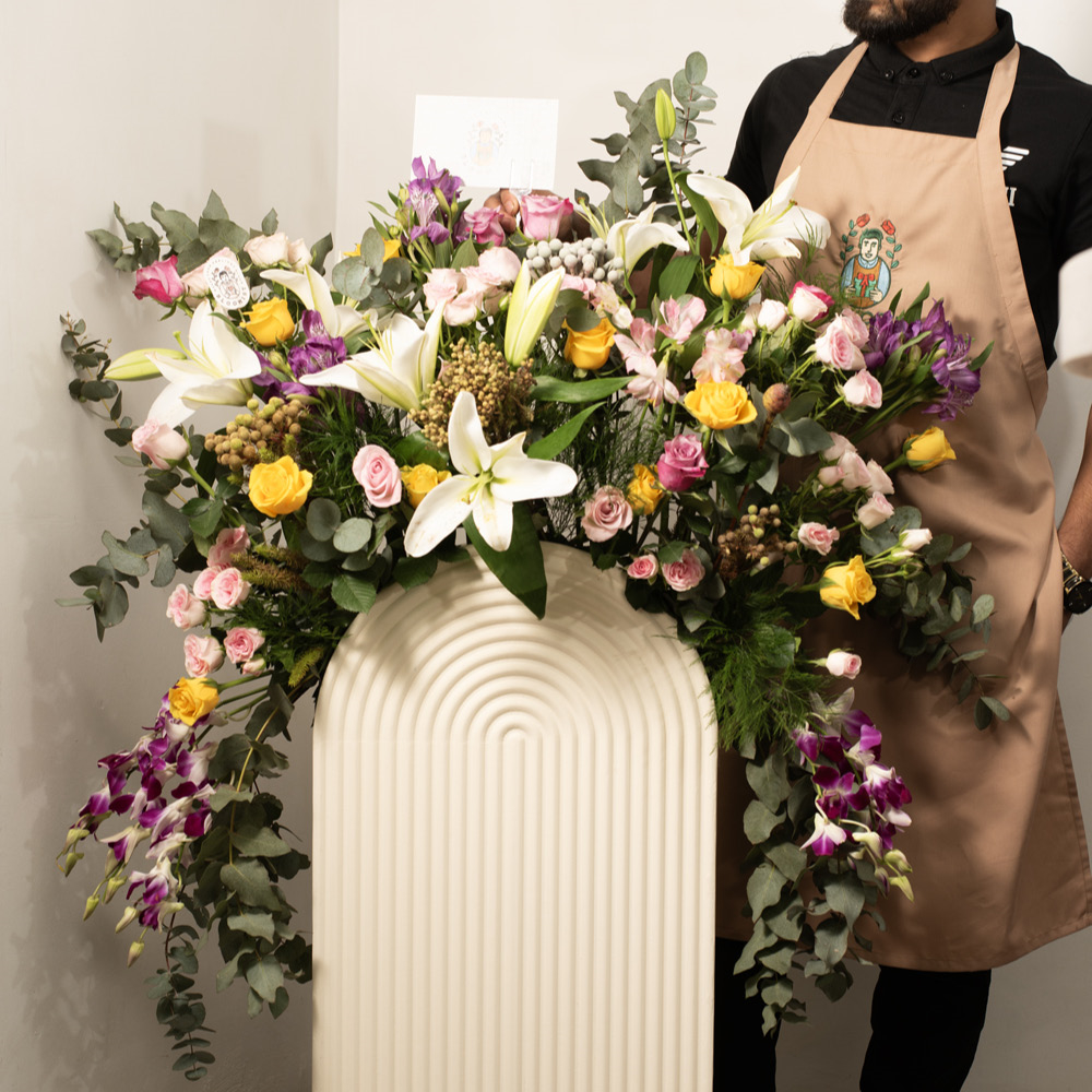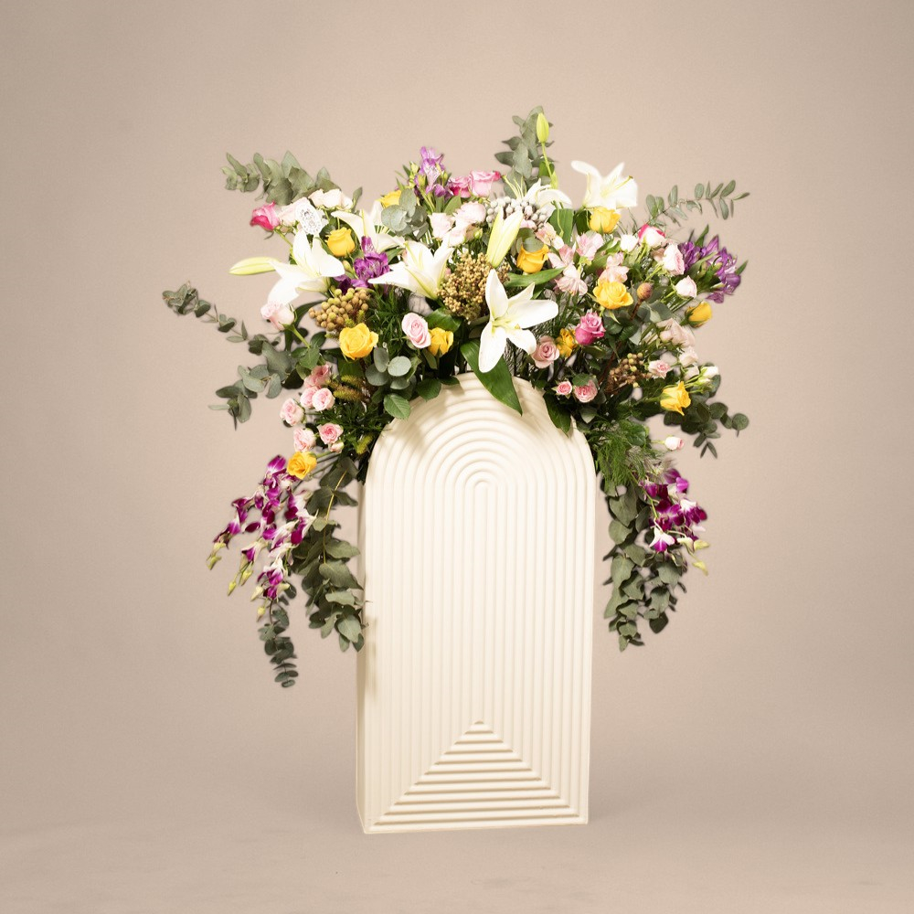 A box filled with roses, baby orchid and casablanca flowers with greens.