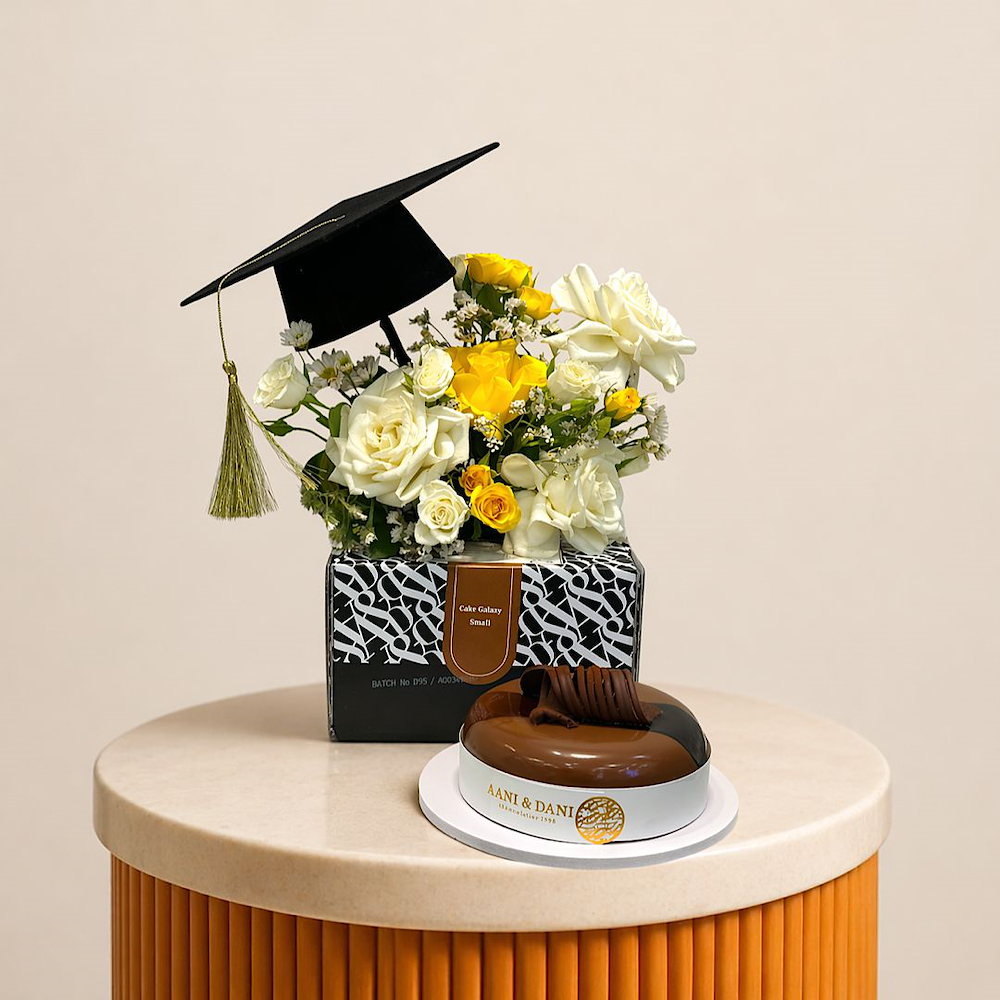 An elegant graduation bouquet featuring roses and baby roses with a luxurious cake by Aani & Dani and graduation topper.
