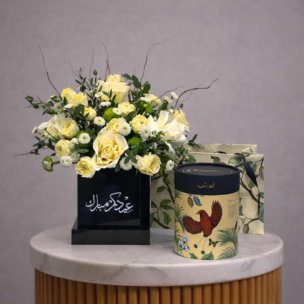 A bouquet that contains roses, baby roses and chrysanthemums along with Anoosh chocolates.