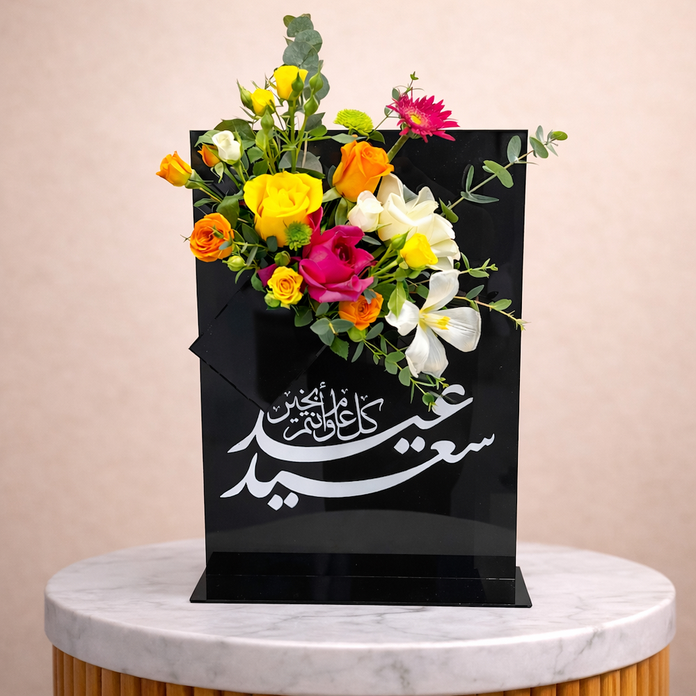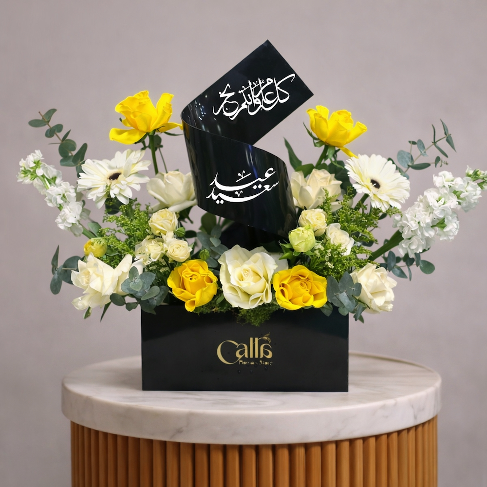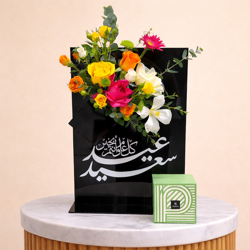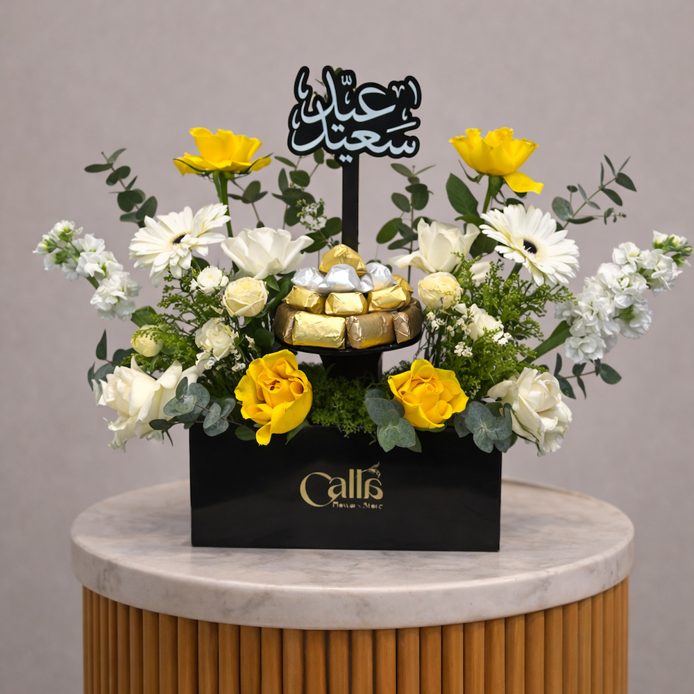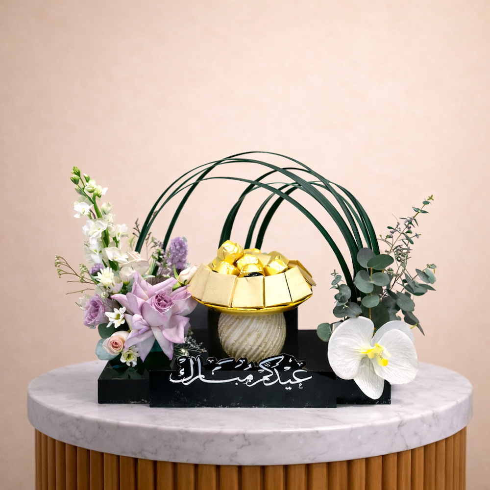 A bouquet containing roses, orchids, and chrysanthemums, arranged beautifully in a box. Comes with chocolates on a plate.