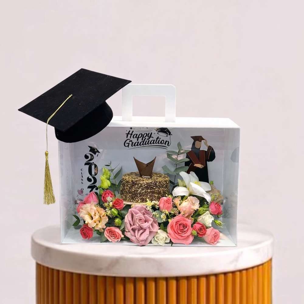 A box filled with roses and baby roses with raspberry cake from Ganache.