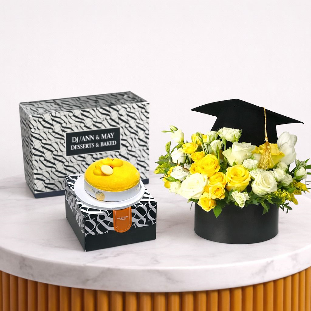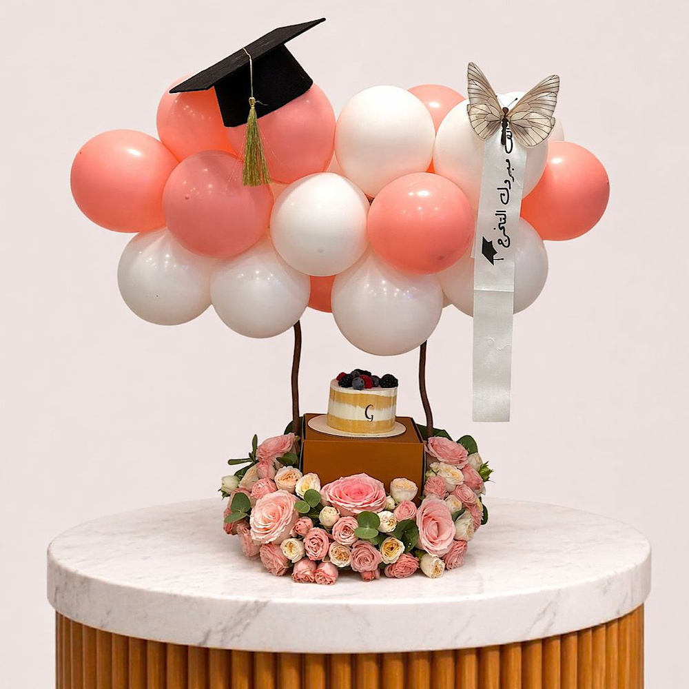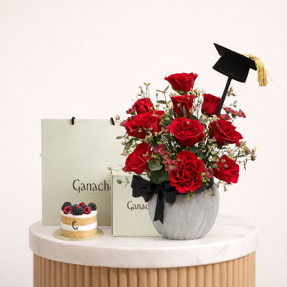 An elegant graduation bouquet in a modern transparent design featuring roses and baby roses with a luxurious cake topped with a rich layer of chocolate and graduation topper.