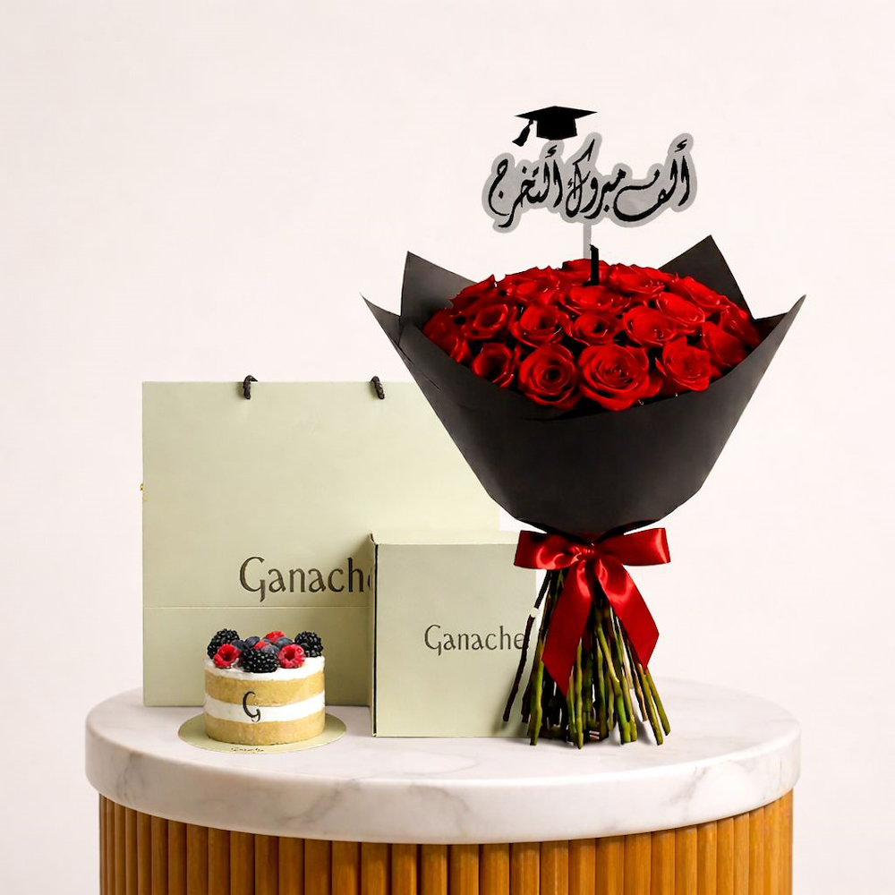 A luxurious bouquet featuring elegant red roses with a luxurious berries cake by Ganache and graduation topper.