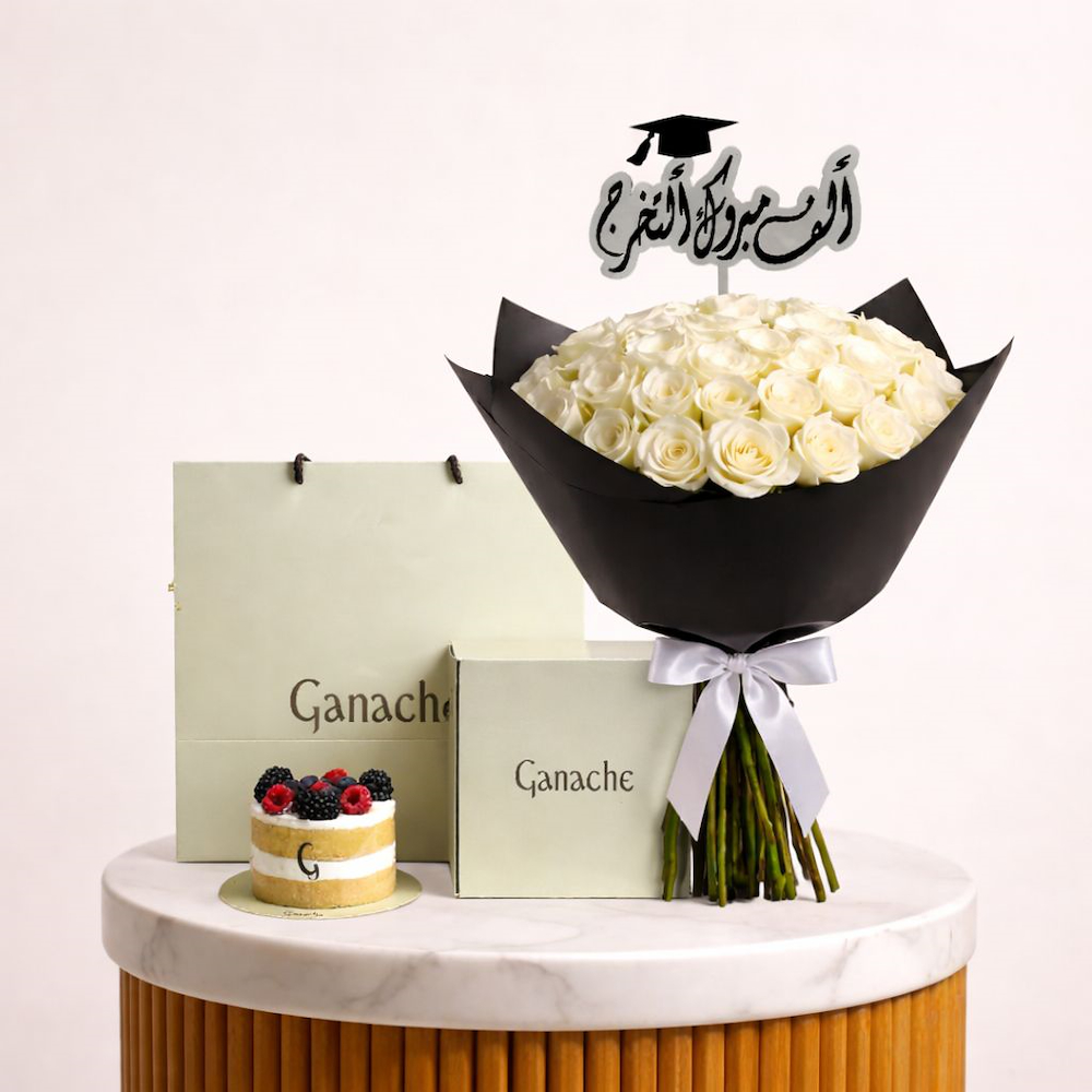 A luxurious bouquet featuring elegant white roses with a luxurious berries cake by Ganache and graduation topper.