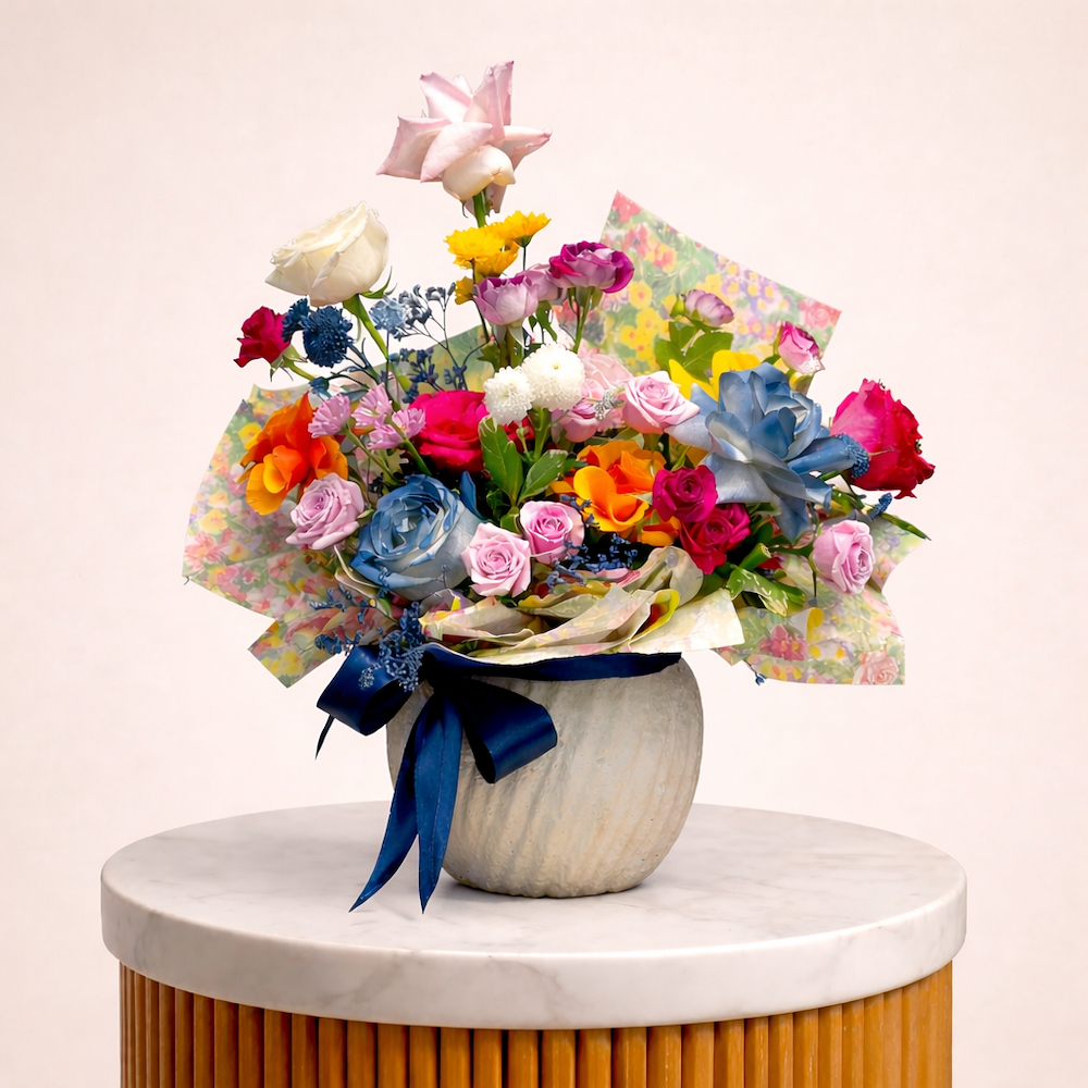 A vibrant and distinctive bouquet, combining multicolored roses in an elegant arrangement within a modern vase, creates a tableau brimming with joy and beauty. The bright colors harmonize with the delicate touches of the roses to evoke a sense of delight and distinction, making it an ideal gift for happy occasions or to add a lively touch to any space.