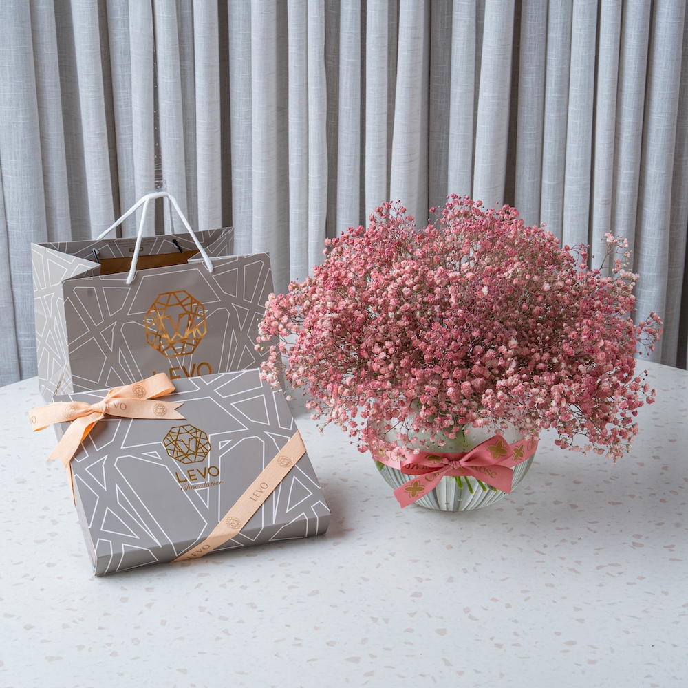 A round vase filled with pink colored gypsophila with Levo chocolate, adding a gentle, feminine touch.