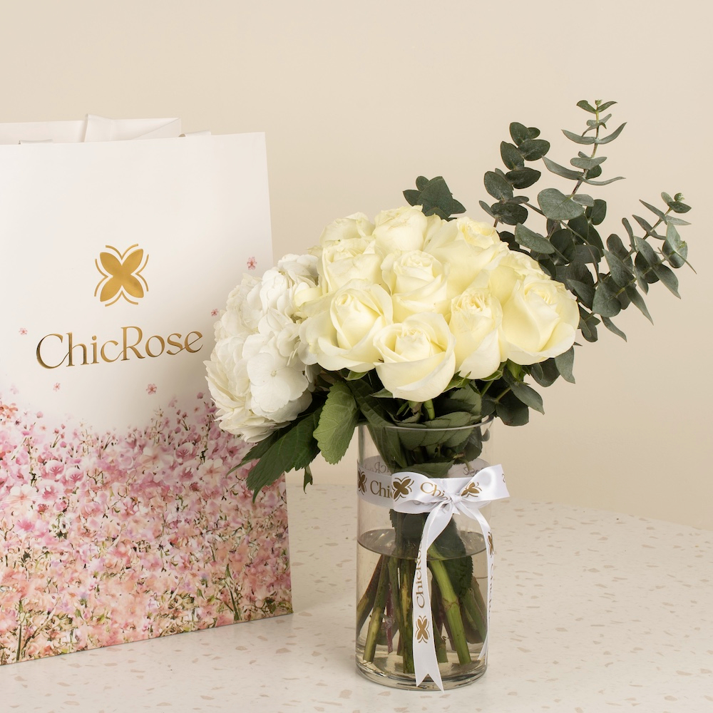 An elegant vase of white roses and hydrangeas, perfect for luxurious gifting.
