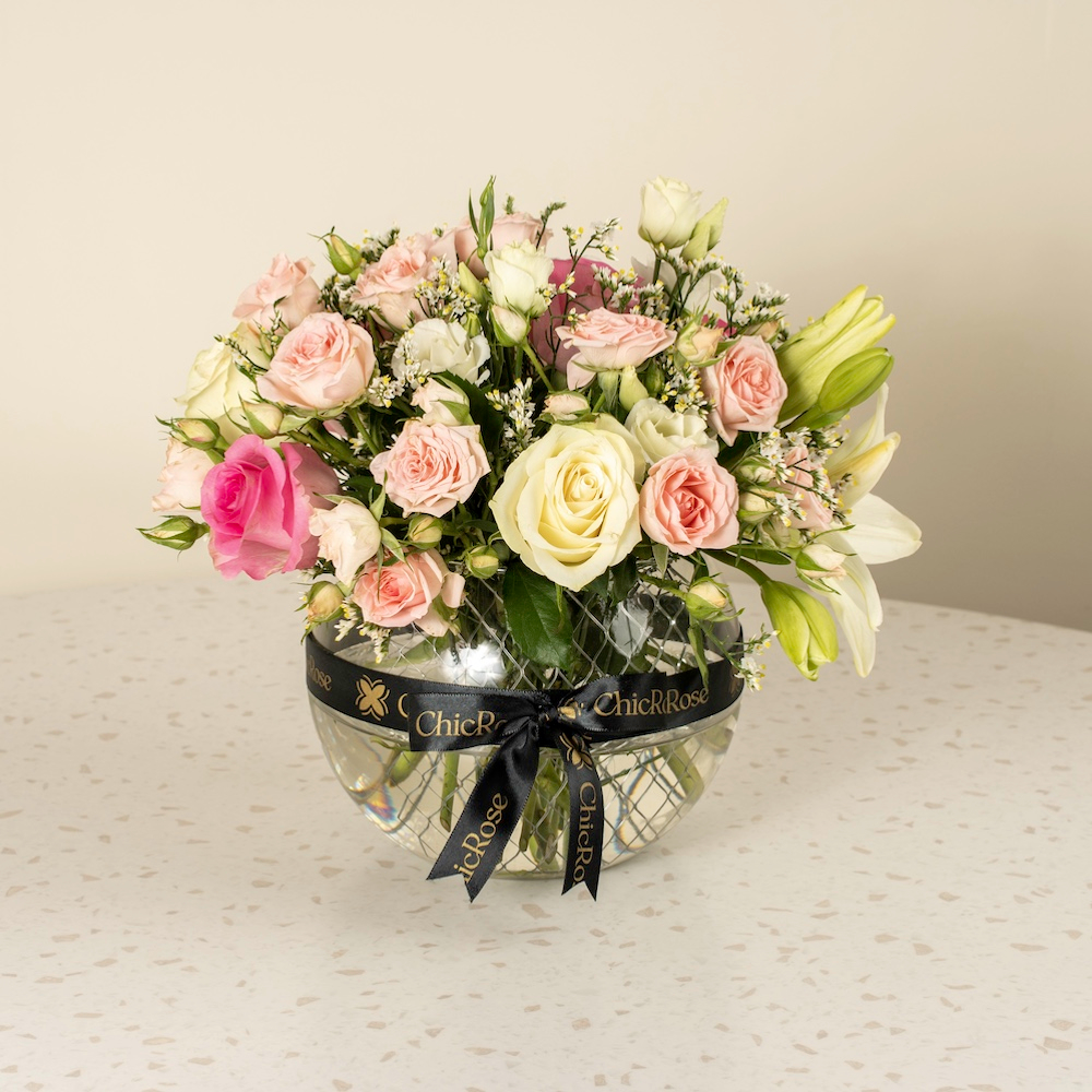 A luxurious round vase featuring roses, baby roses, and lilies in pink shades, perfect for adding a touch of elegance and beauty to any occasion.