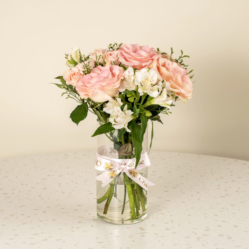 An elegant vase of roses and alstroemeria flowers, perfect for special gifts and luxurious occasions.