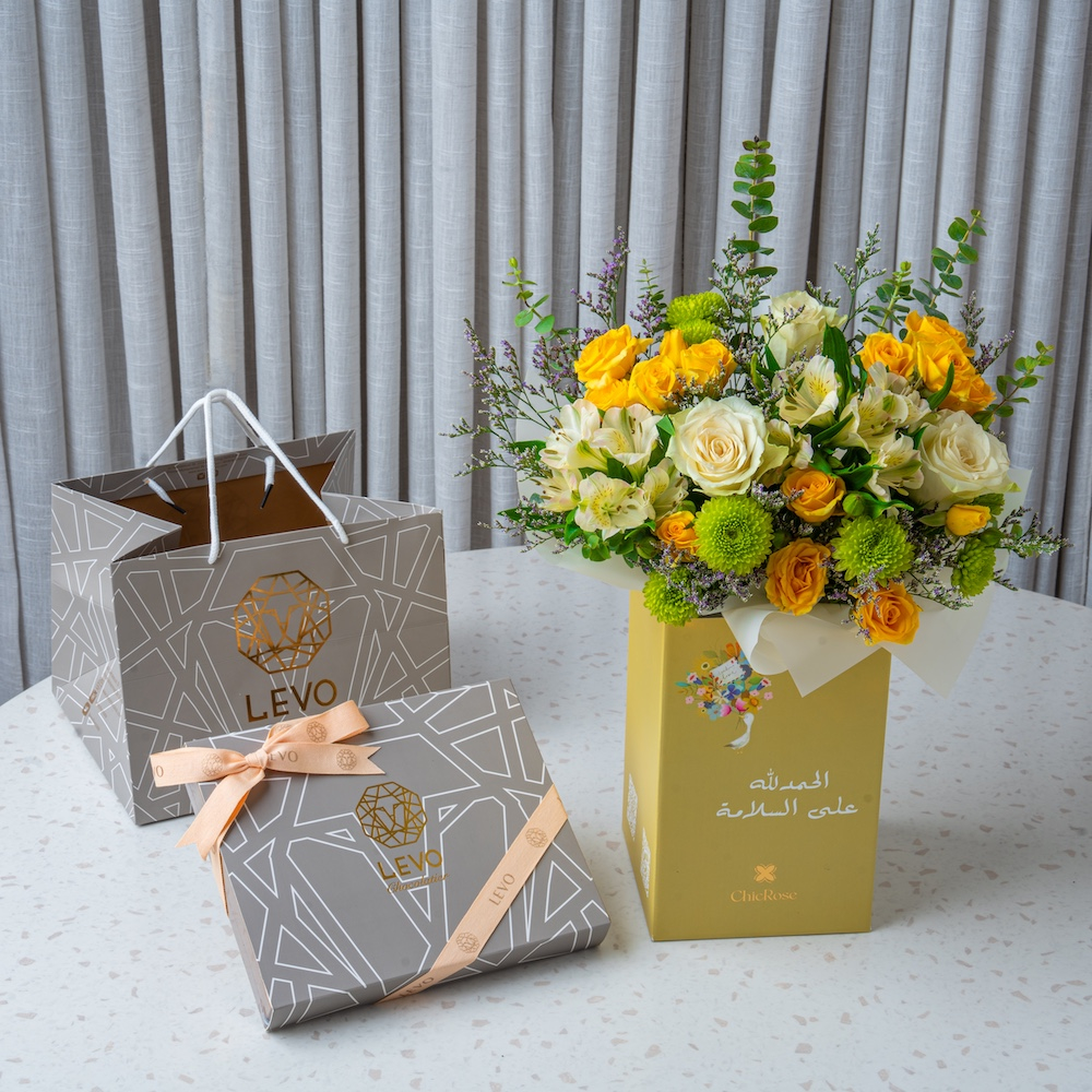 A bag filled with roses, baby roses, and alstroemeria flowers, paired with Levo chocolate for a warm and cheerful gift.