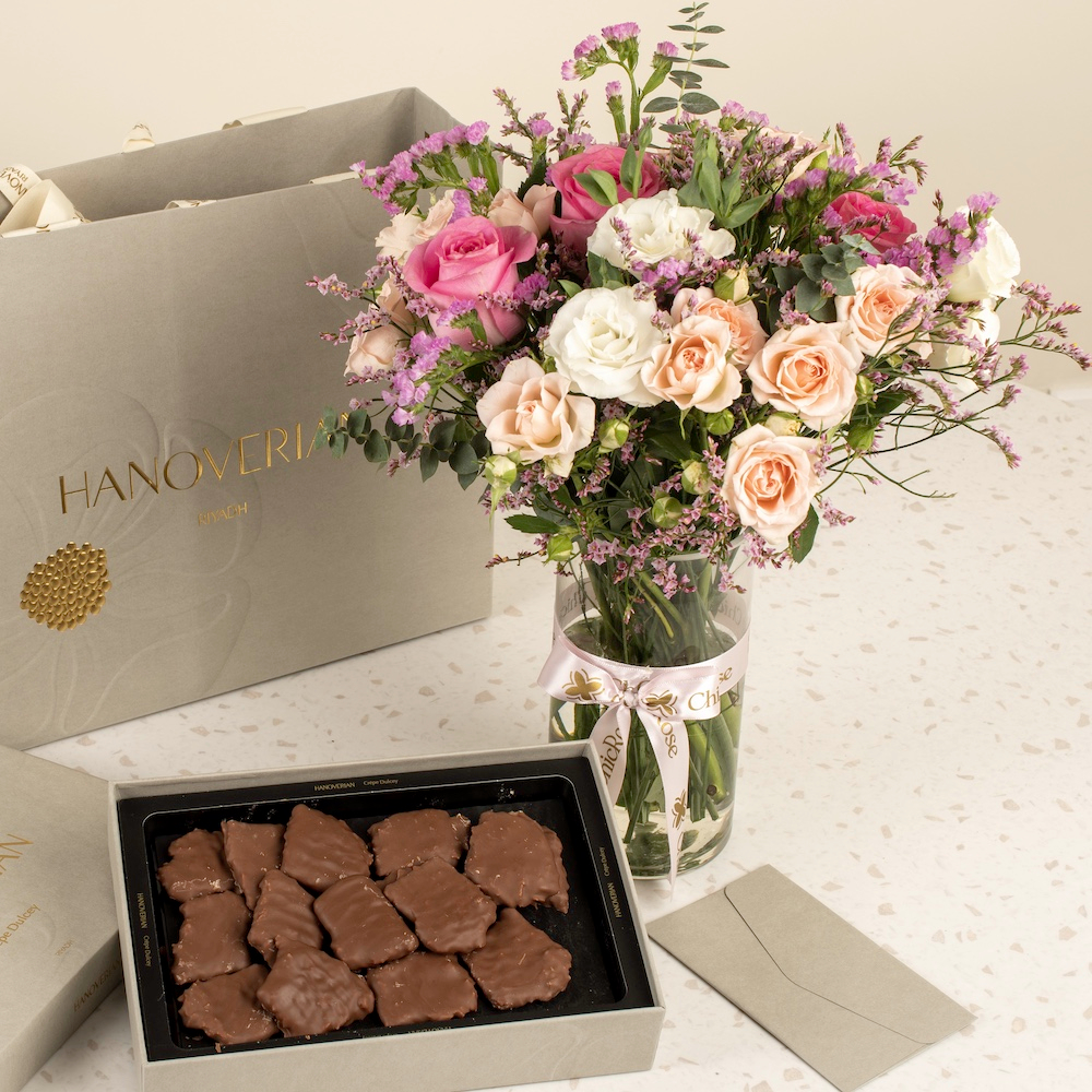 An elegant vase featuring soft pink roses and baby roses with 30 pieces of Hanoverian chocolate.