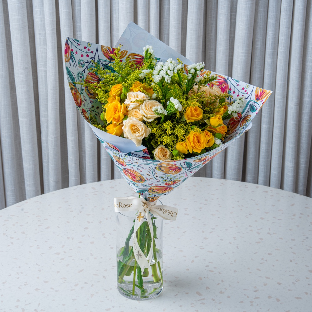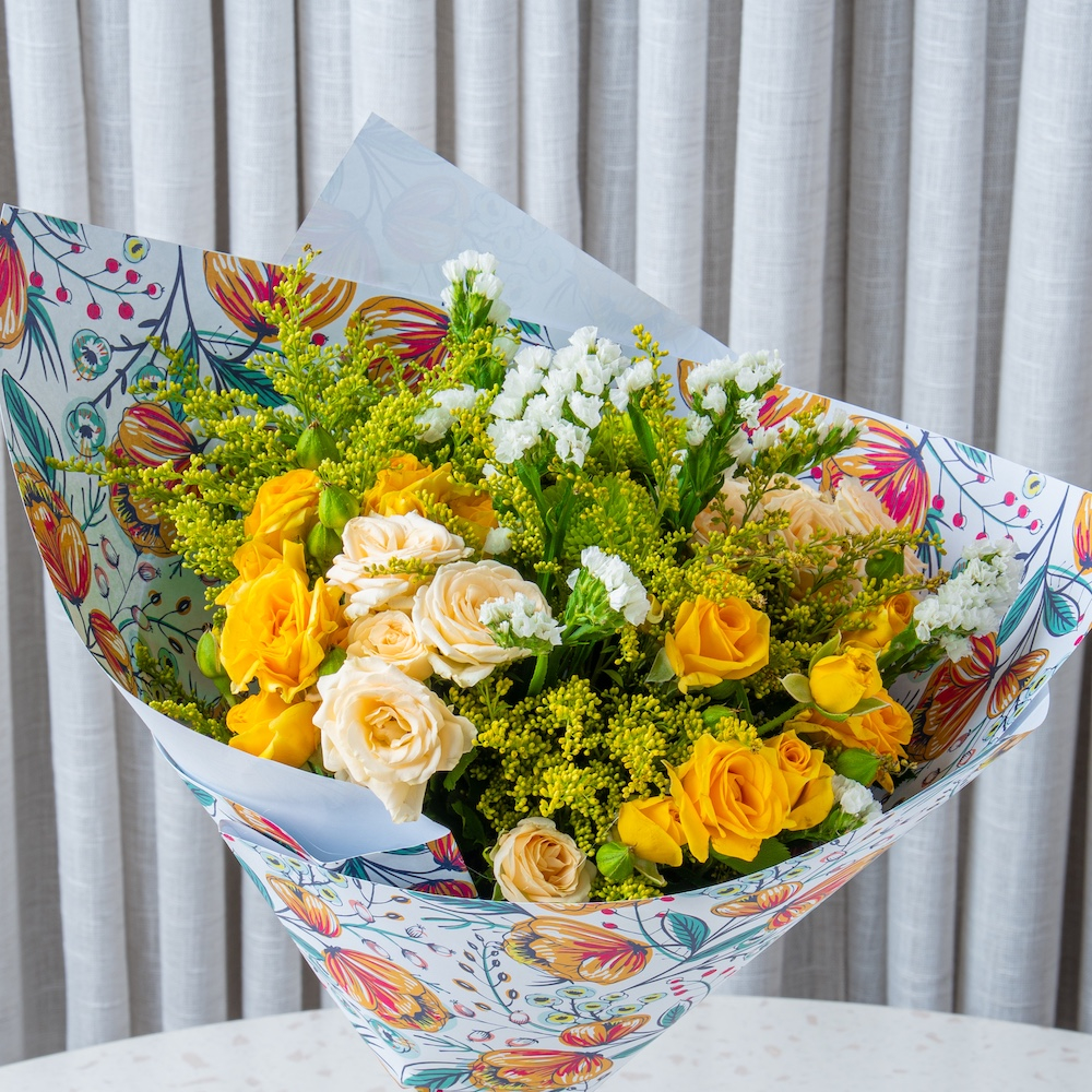 A bouquet of yellow and white baby roses wrapped in vibrant, colorful paper, perfect for adding brightness and cheer to any occasion.