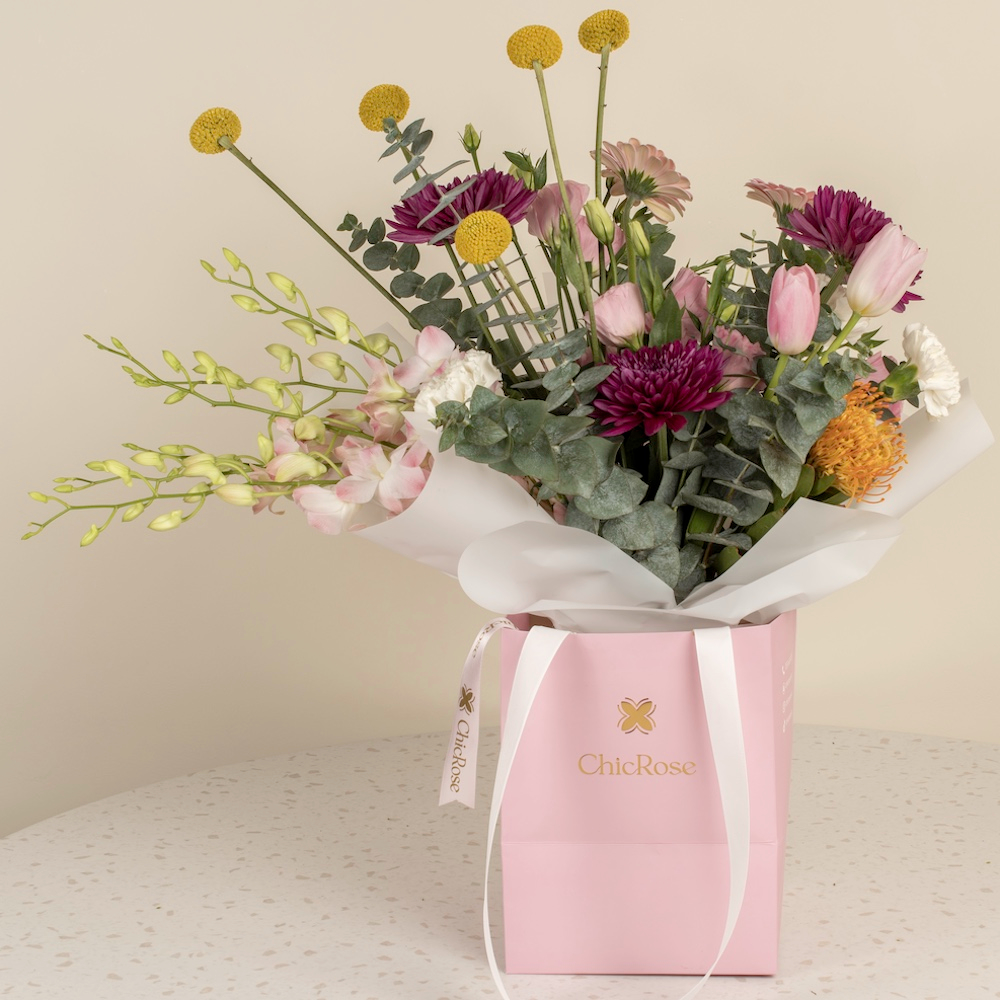 A luxurious bouquet of baby orchid, tulips, and roses with elegant wrapping, reflecting refined taste.