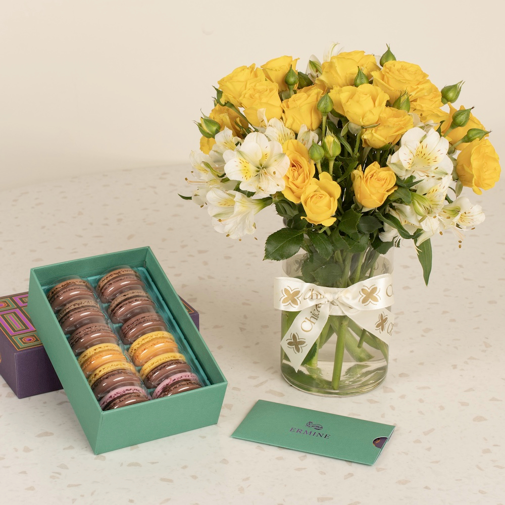 An elegant vase featuring baby roses and alstroemeria paired with Ermine macarons, adding a bright, lively, and sweet touch.