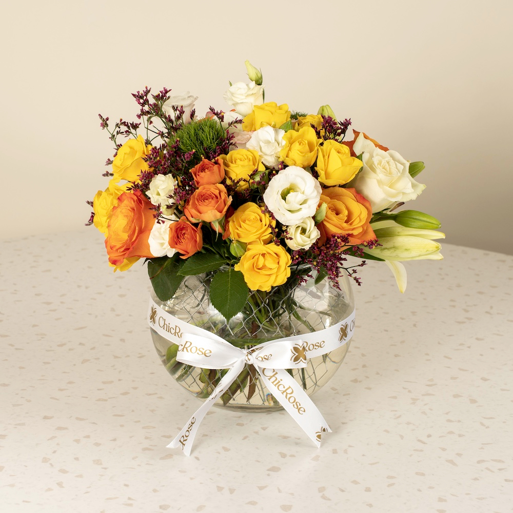 A luxurious round vase filled with roses, baby roses, and lilies in sweet shades, perfect for adding a touch of elegance and beauty to any occasion.