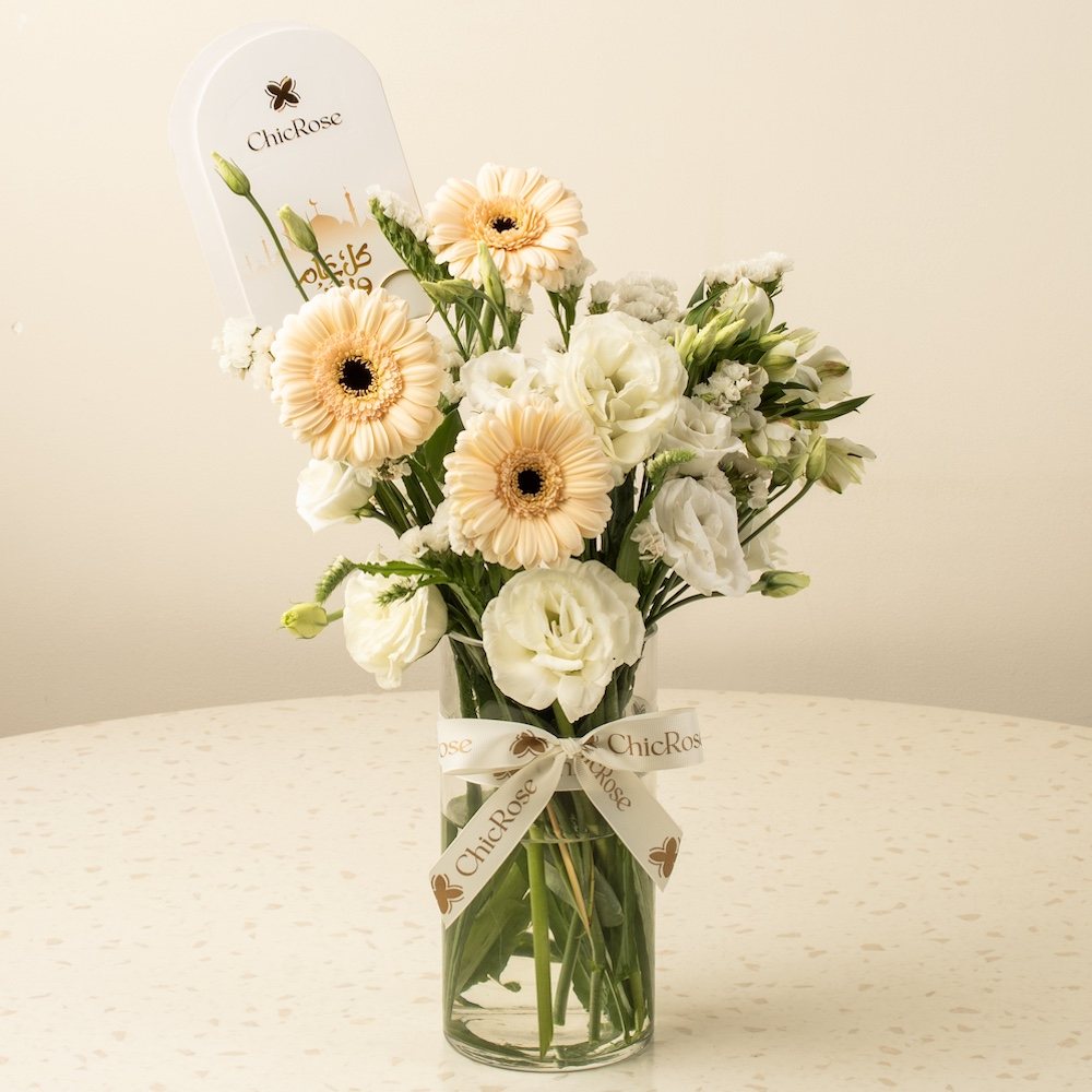 An elegant arrangement featuring gerbera, lisianthus, and alstroemeria with touches of white statice.