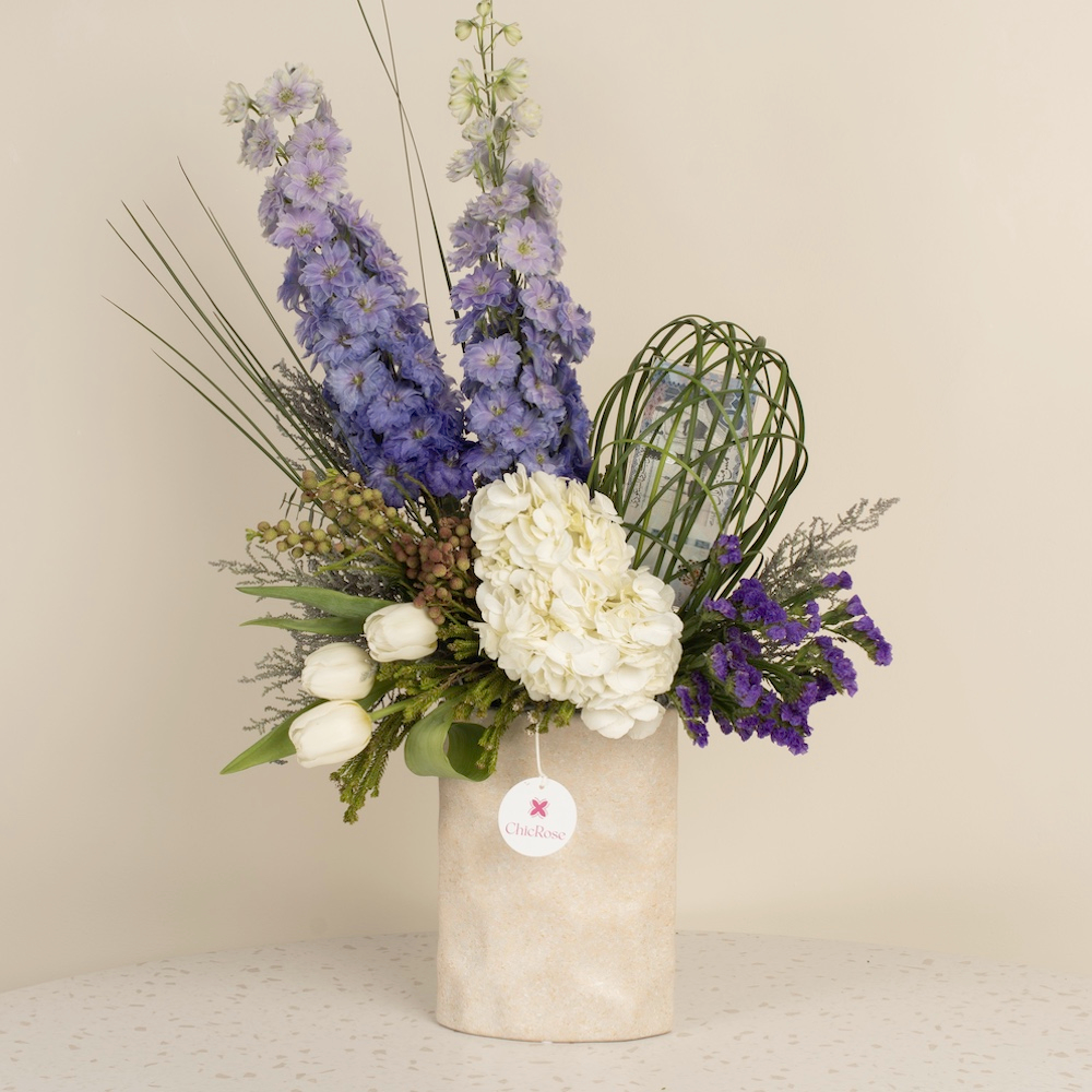 A luxurious vase of Dutch roses, tulips, hydrangeas, and delphiniums, perfect for gifting with a touch of elegance.
