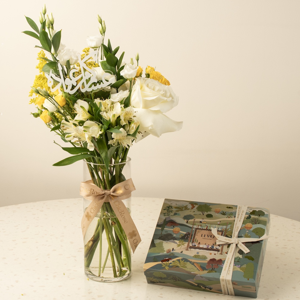 A cheerful alstroemeria vase with Levo premium chocolate box.