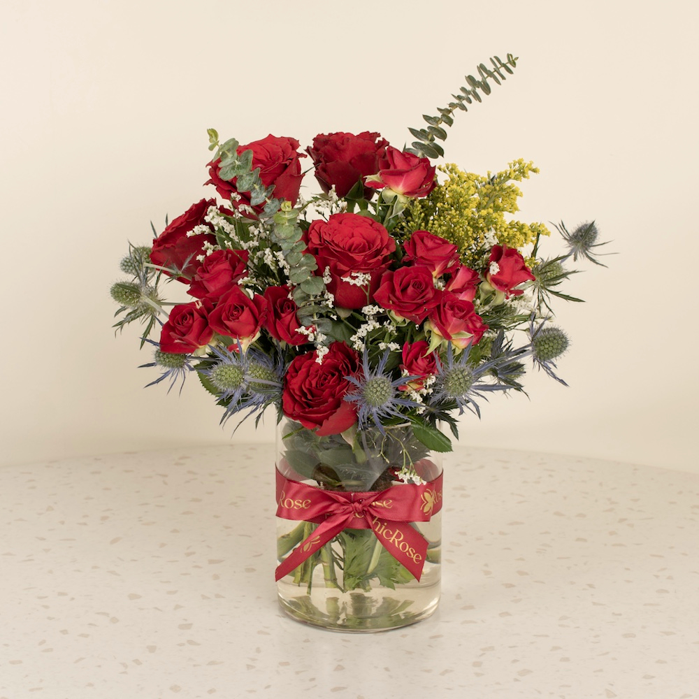 A medium vase featuring red roses paired with eryngium, adding a romantic and modern touch to any setting.