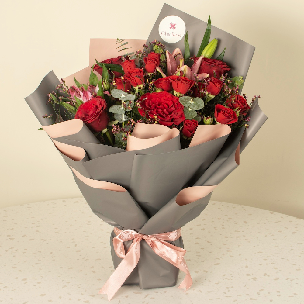 A bouquet of red roses, wrapped in elegant gray wrapping.