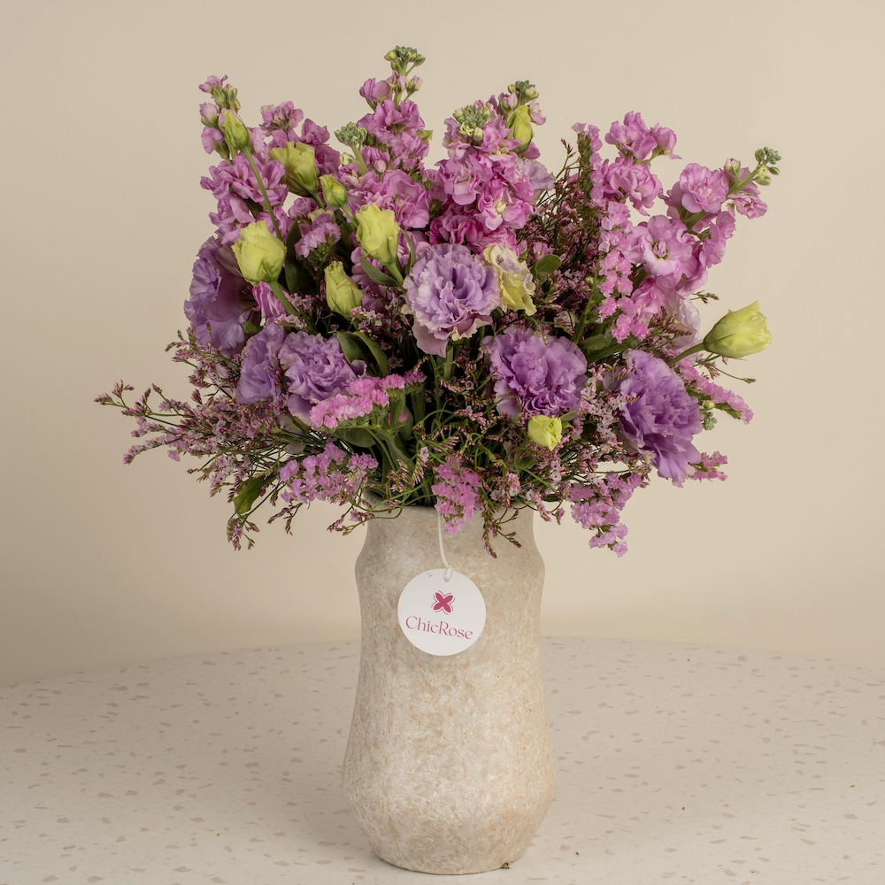 A luxurious vase featuring carnation and matthiola flowers, making it the perfect gift for any special occasion.