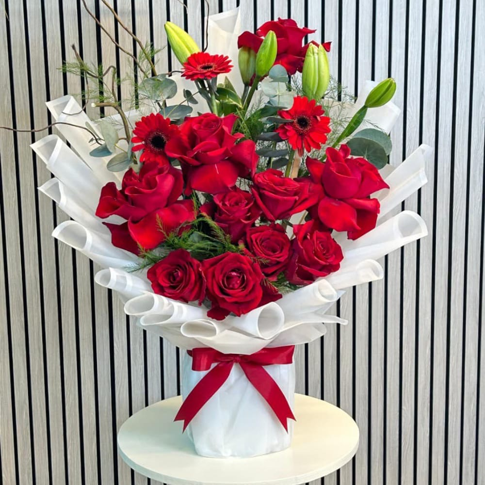 A hand bouquet containing roses, lilies, and gerberas, arranged beautifully.
