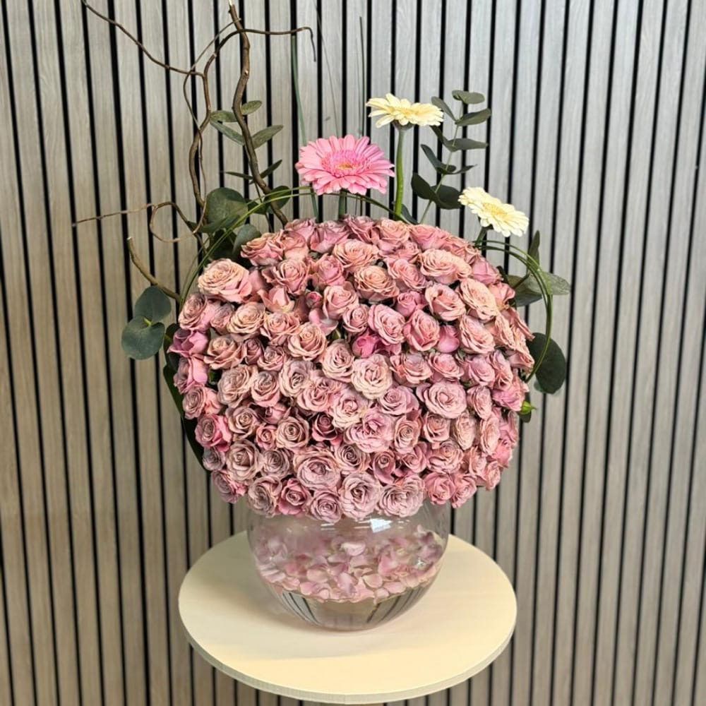 A bouquet containing baby roses and gerberas, arranged beautifully in a vase.
