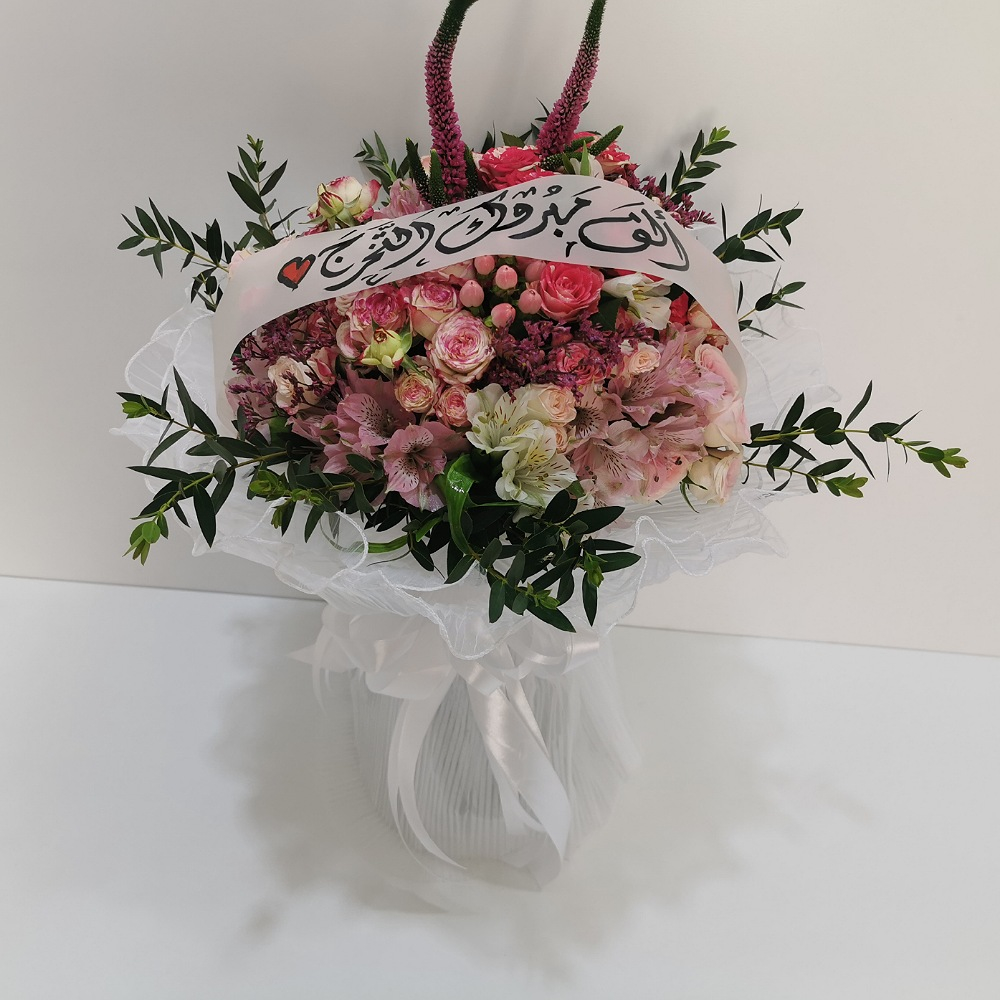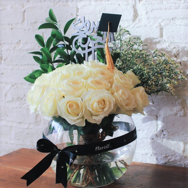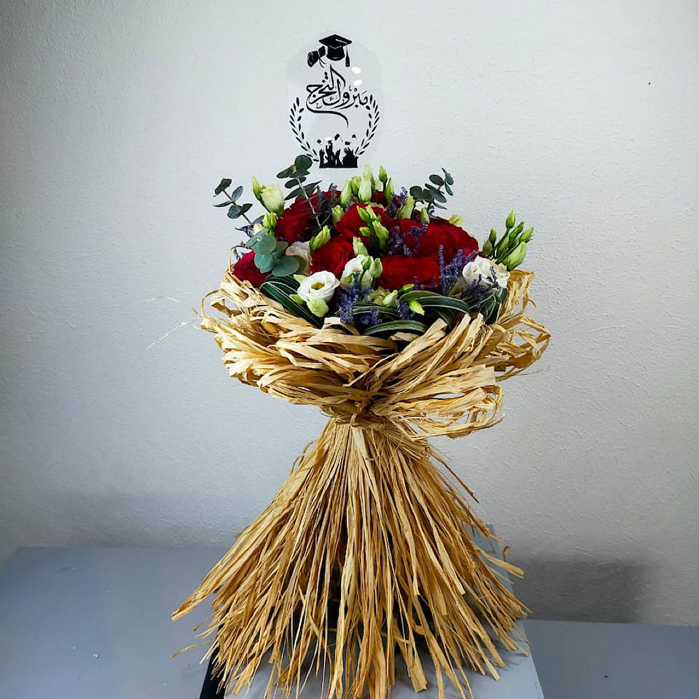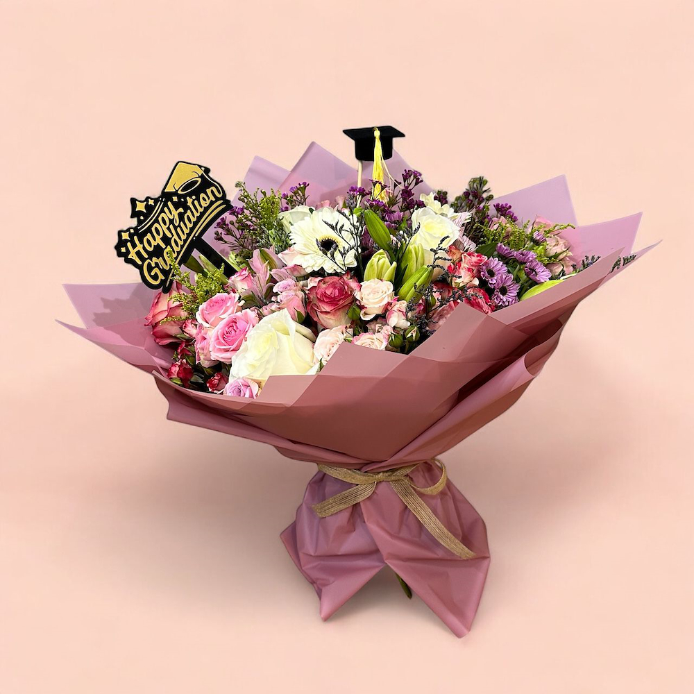 This bouquet contains roses, and mixed flowers with graduation topper and graduation helium balloons.