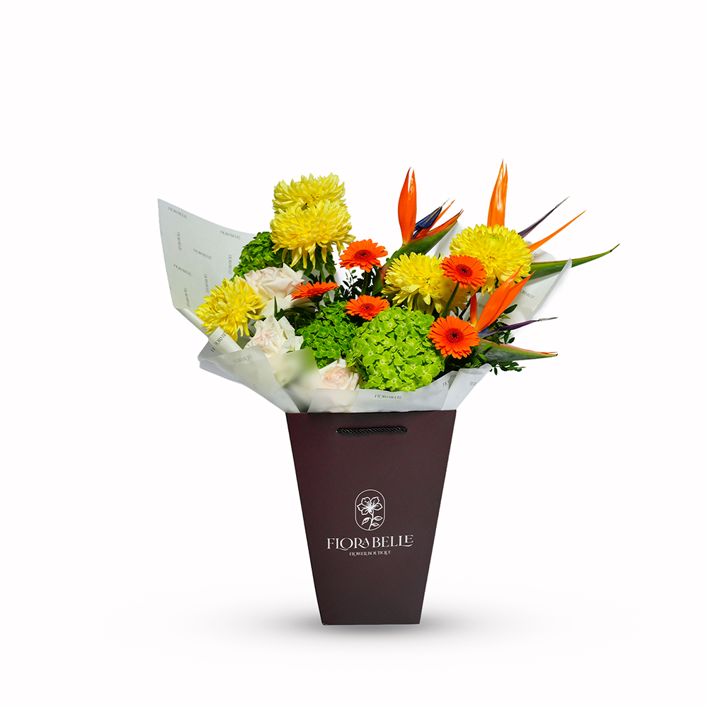A hand bouquet that contains roses, gerberas, baby orchids and chrysanthemums.
