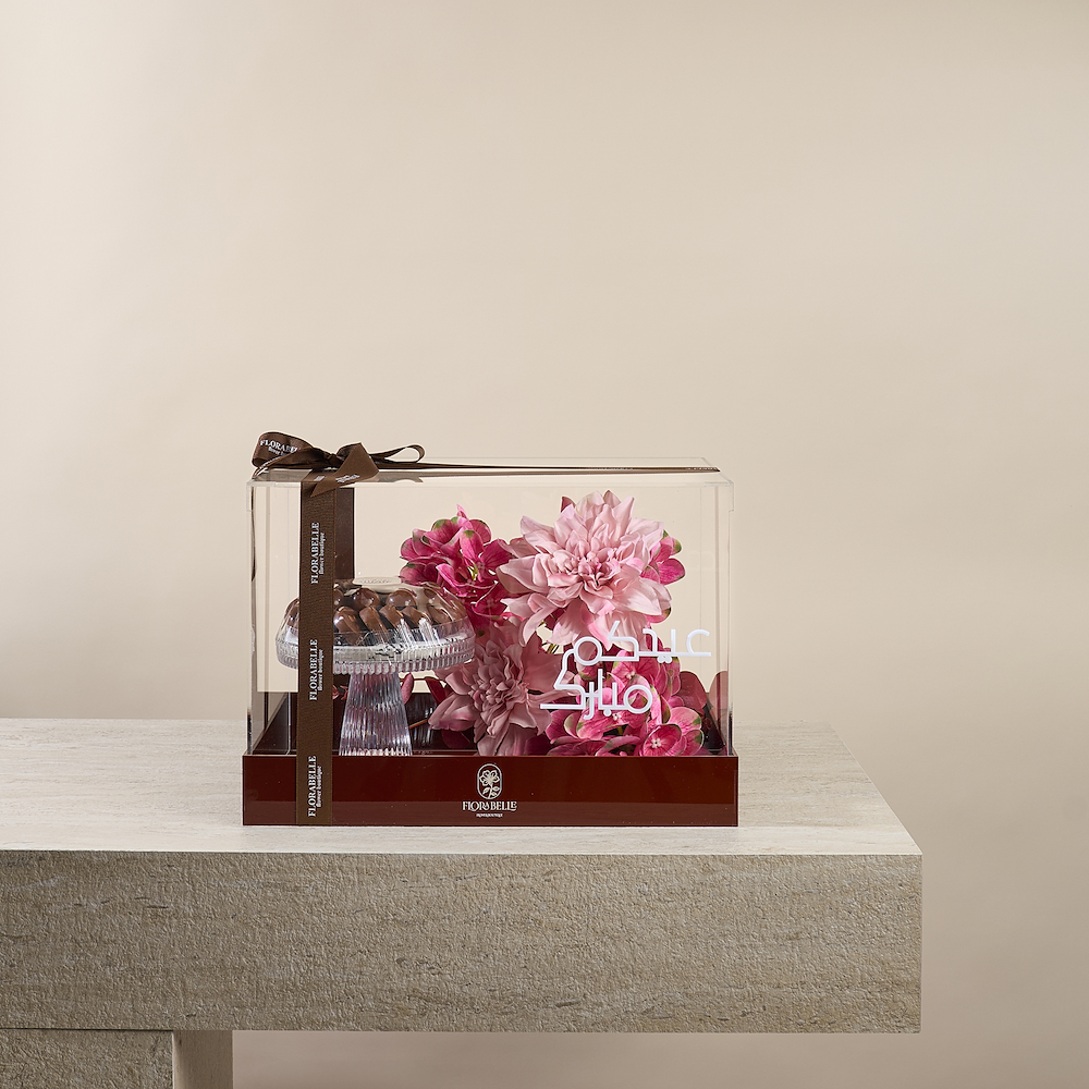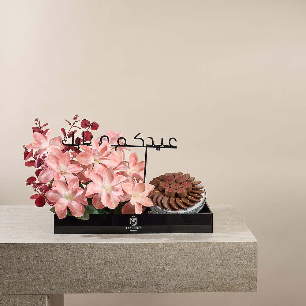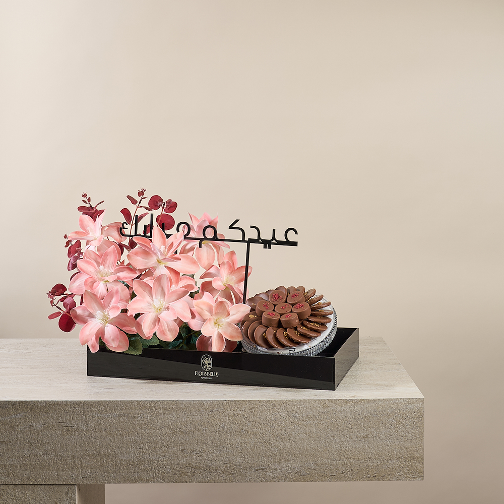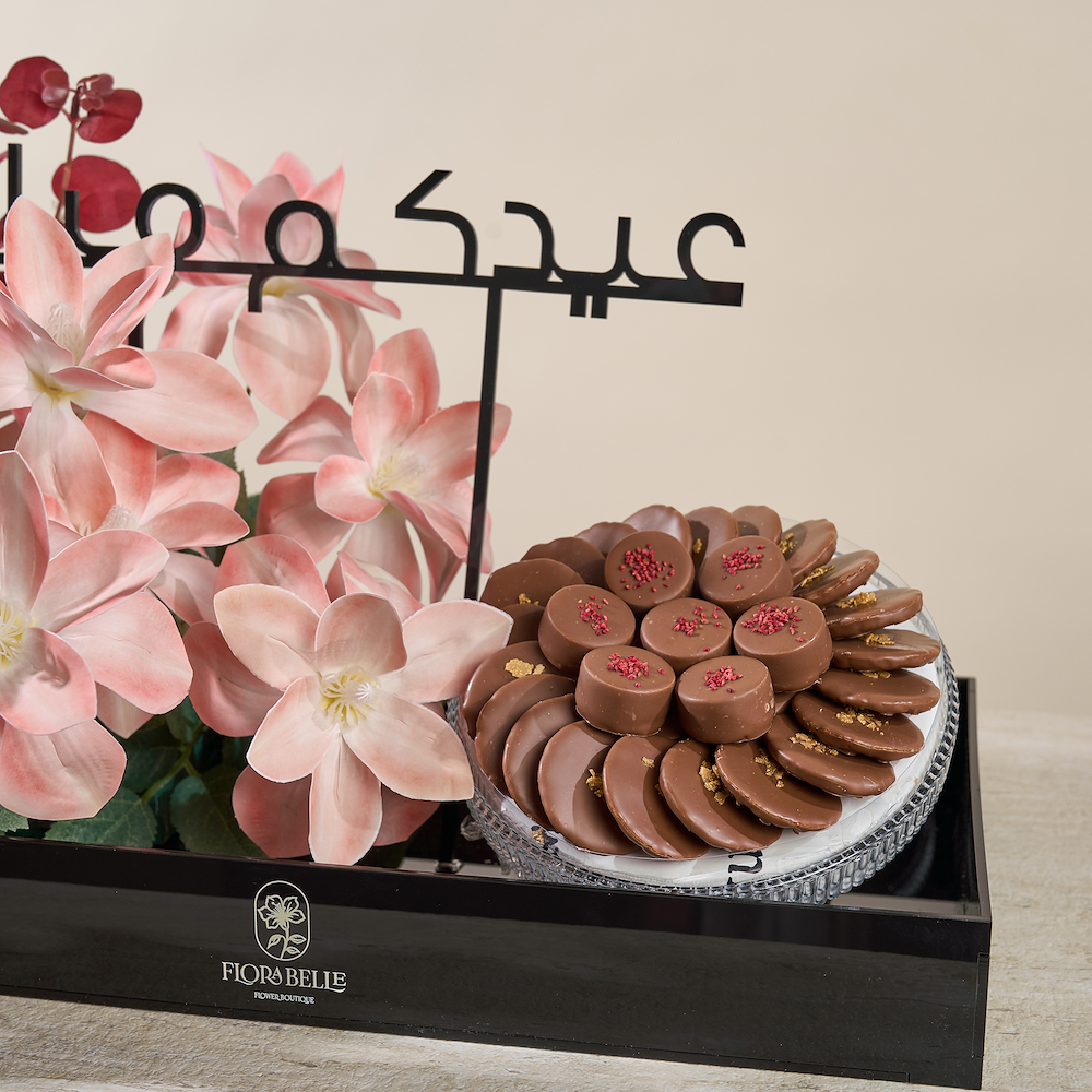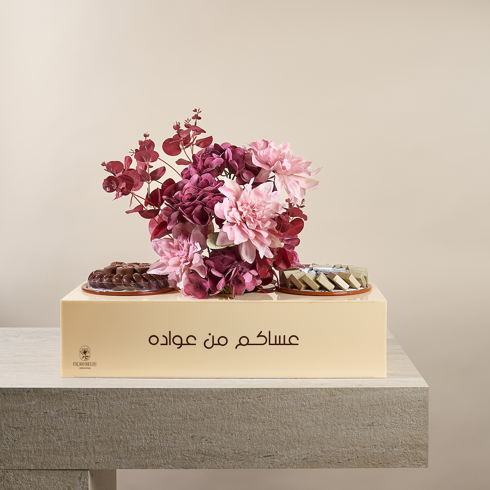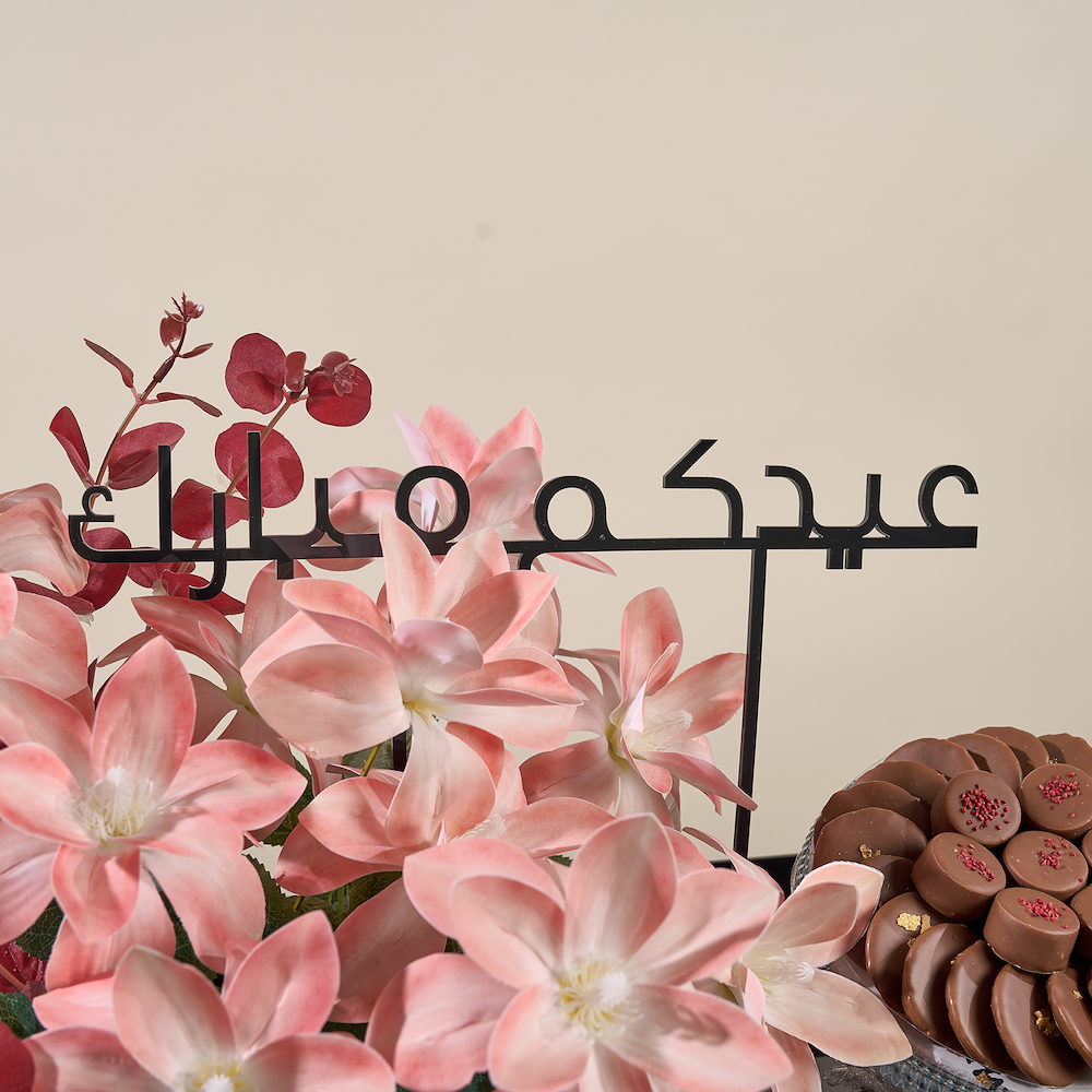 An elegant acrylic tray featuring high-quality everlasting artificial flowers, with a "Eid Mubarak" embellishment that touches the hearts of your loved ones and adds a festive atmosphere for Eid. The tray also includes a selection of 380g of premium Belgian chocolates with special fillings, making it a sophisticated gift that combines beauty and luxury while creating joyful moments with your loved ones.