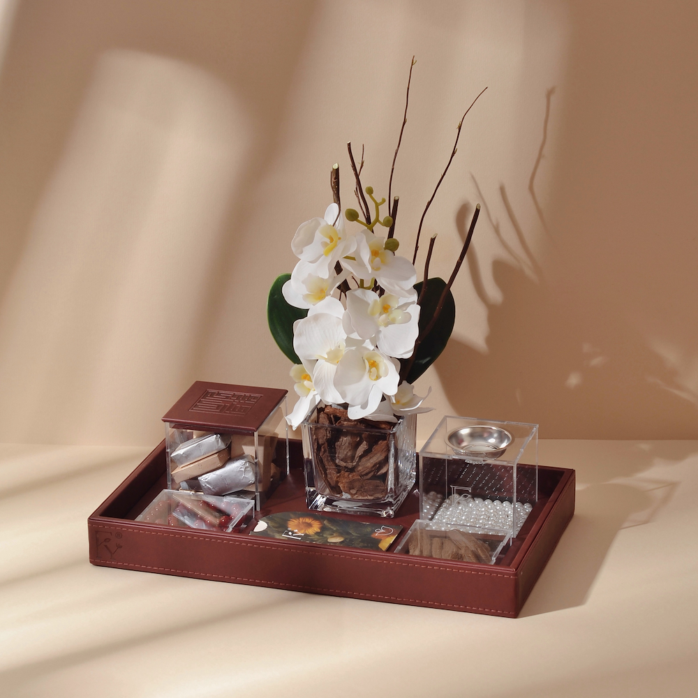 A tray containing artificial flowers with a box of chocolates from Patchi, an acrylic incense burner, luxurious Moroki bukhour, a Bakelite rosary, and a gift card.