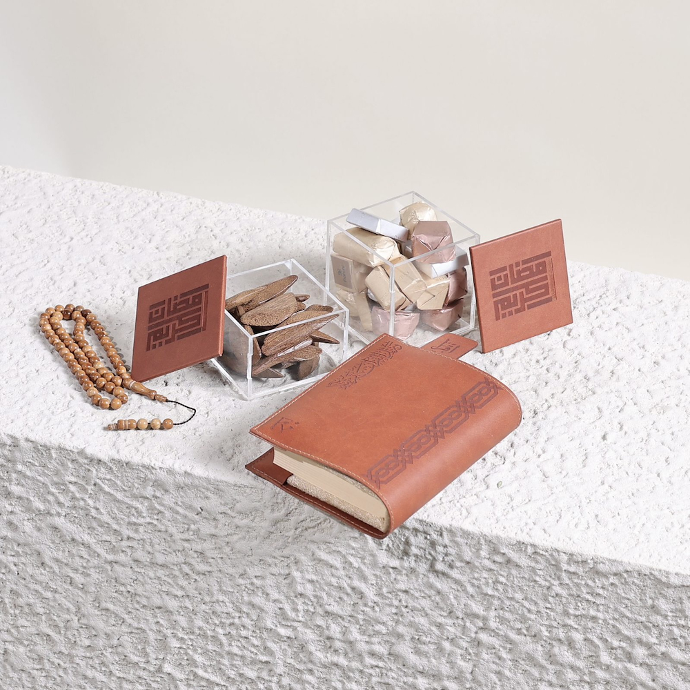 A luxurious set featuring: A ceramic vase of epipremnum plant. A Patchi chocolate box. Moroccan bokhour box. A beads. A Holy Quran. A Quran divider.