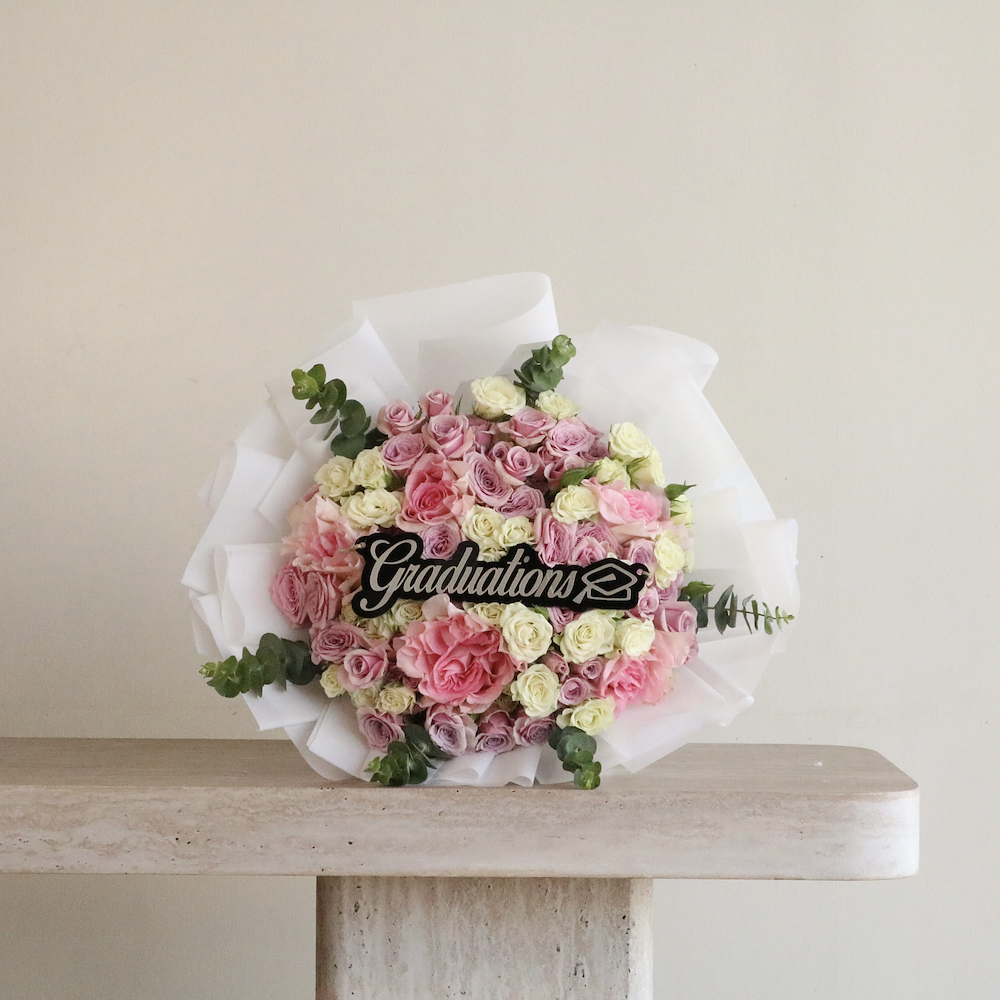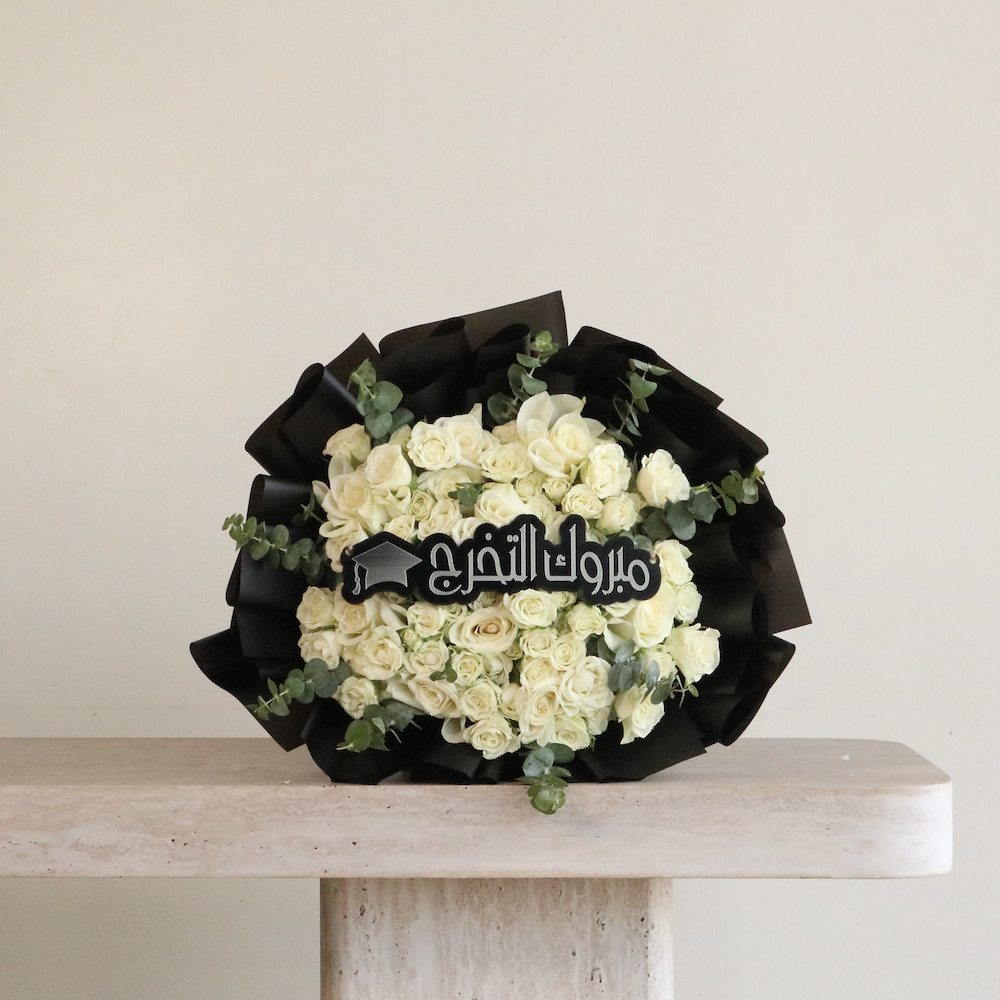 A hand bouquet that contains roses, baby roses and eucalyptus leaves elegantly wrapped in black.