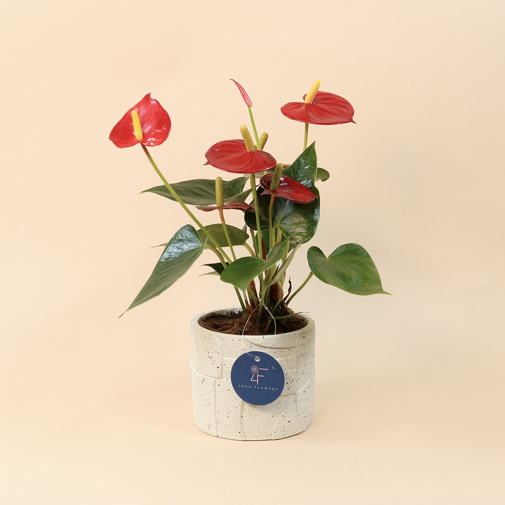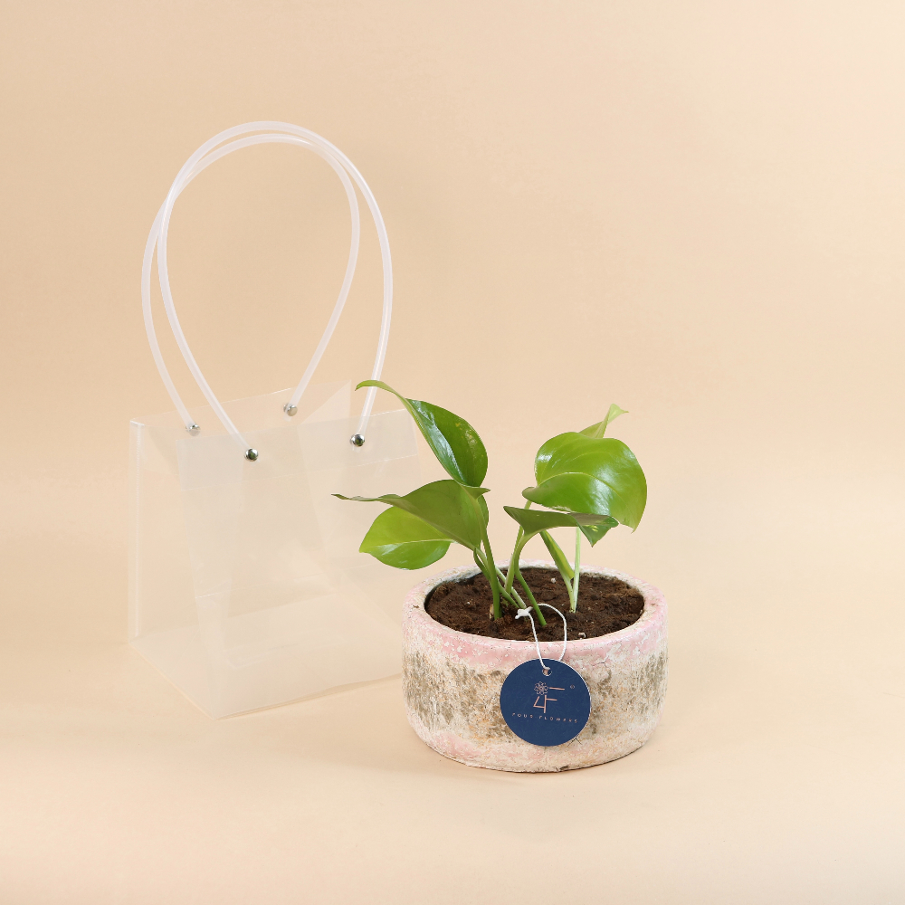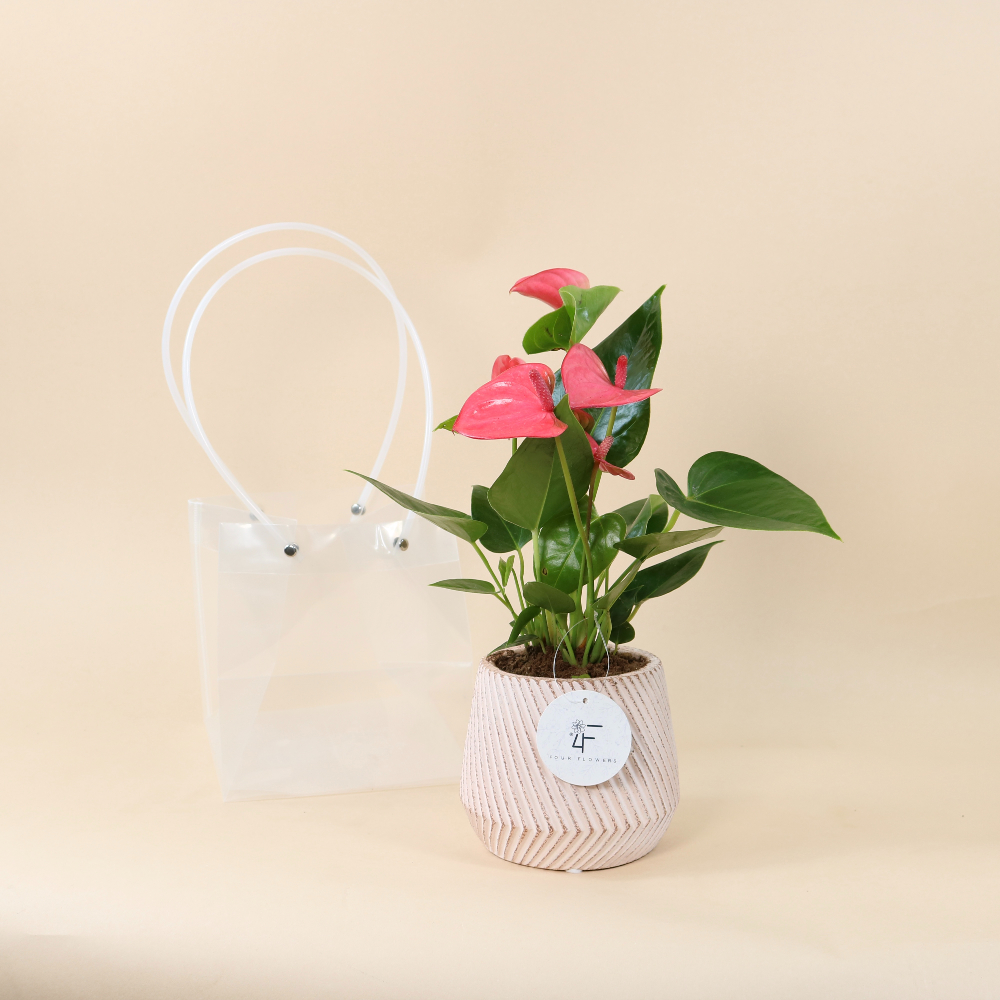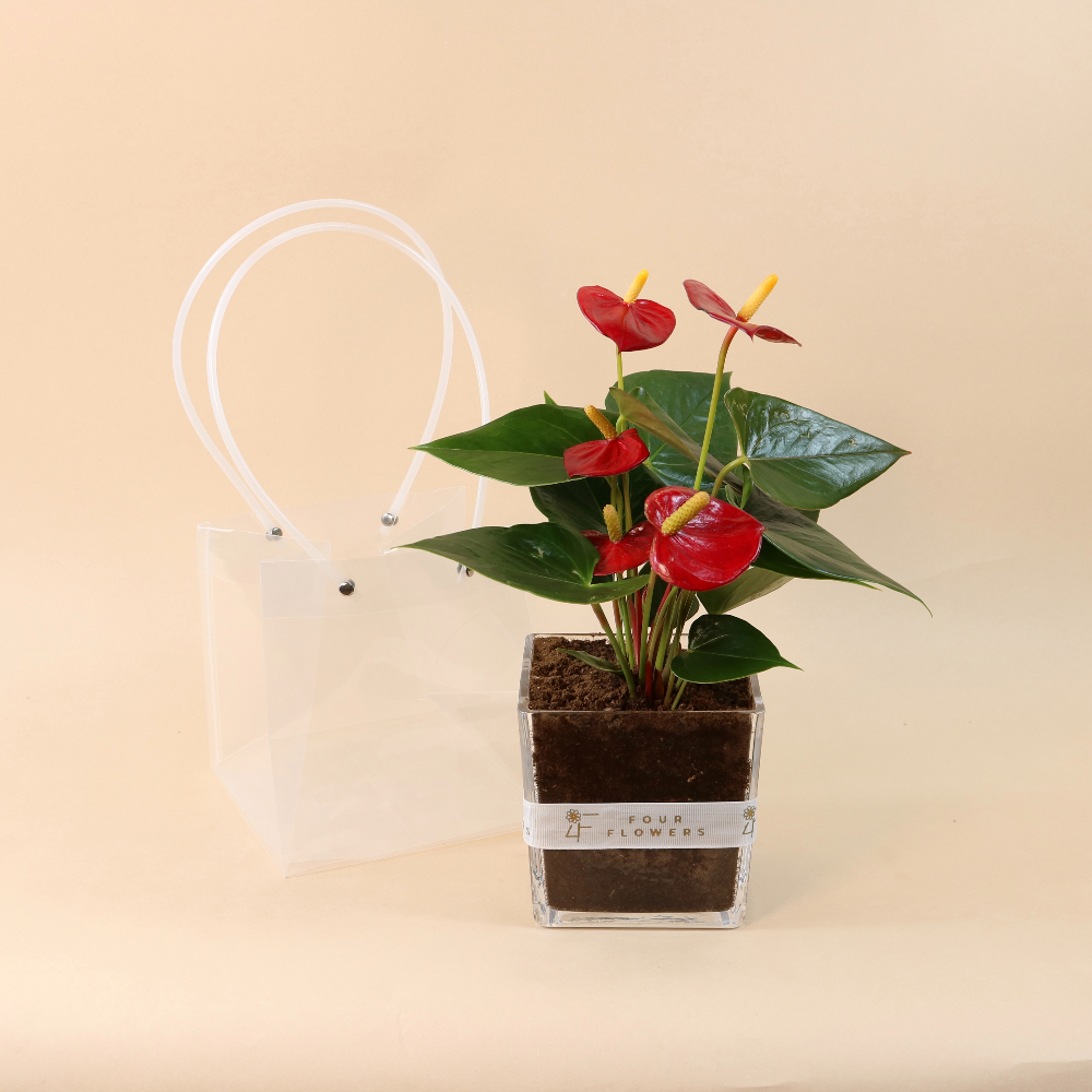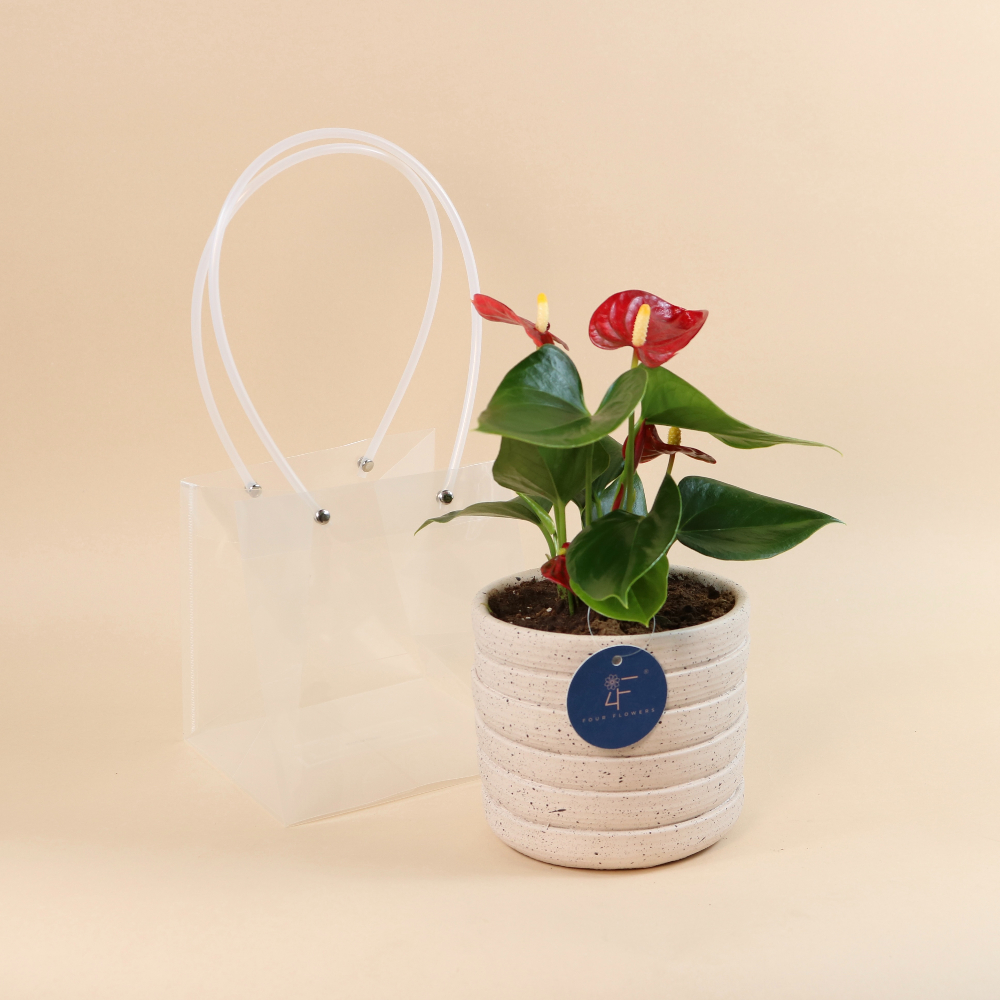 An elegant ceramic vase featuring a red anthurium plant with a transparent carrying bag for the vase.