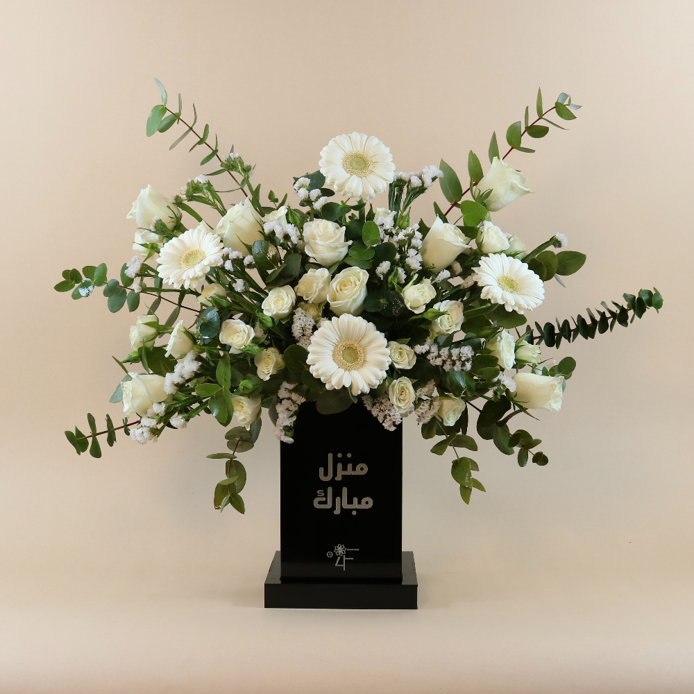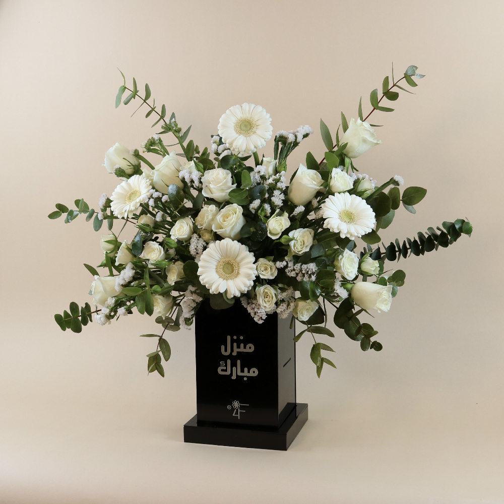 An acrylic stand with a "Blessed Home" phrase in an elegant design, arranged with roses, baby roses, and gerberas. The perfect housewarming gift.