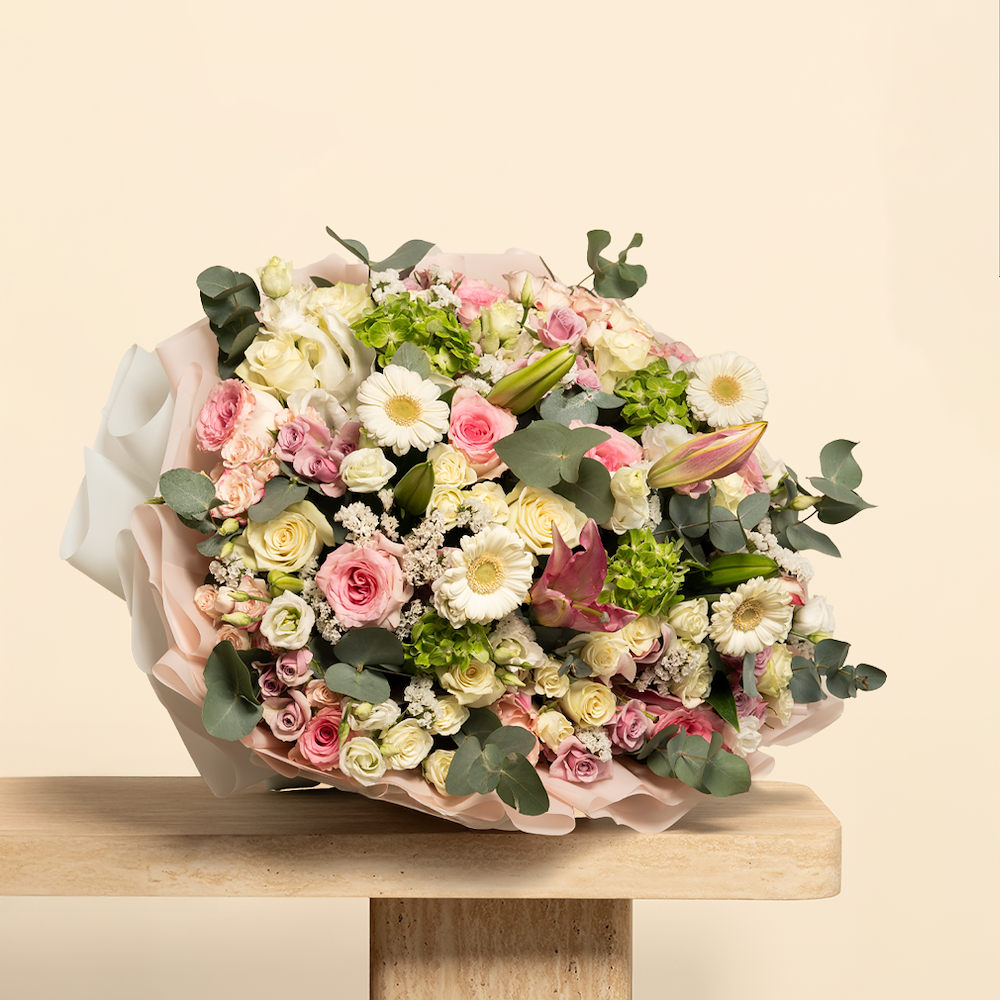 A large hand bouquet containing baby roses, hydrangeas, gerberas, and lilies, arranged beautifully.
