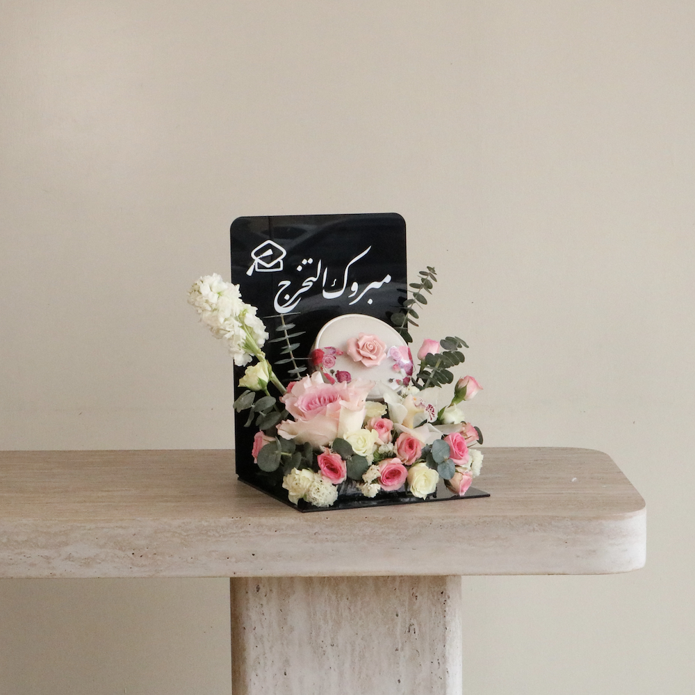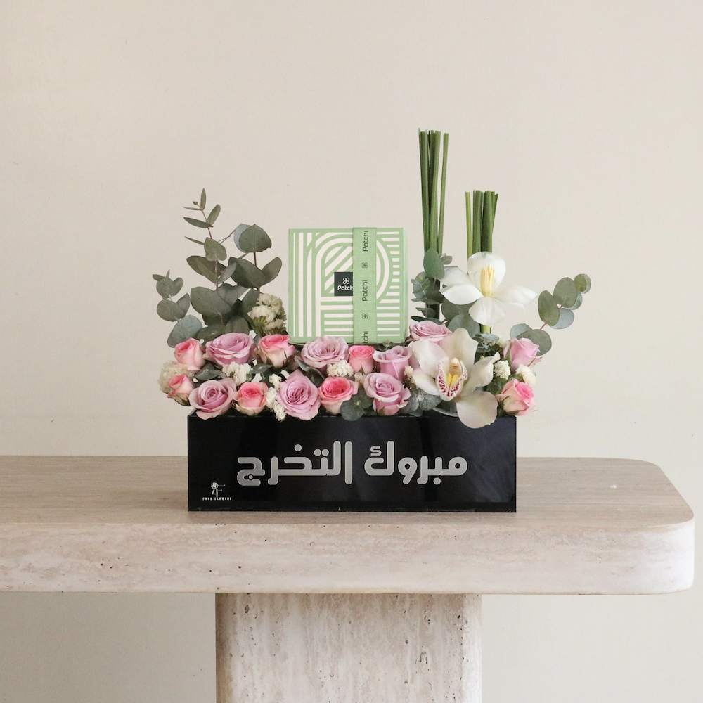 A box that contains roses, eucalyptus leaves, a tulip, and an orchid, beautifully presented with chocolates from Patchi.