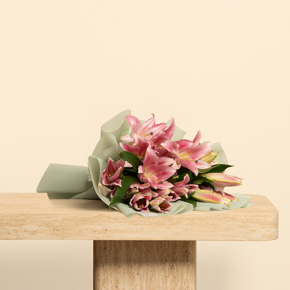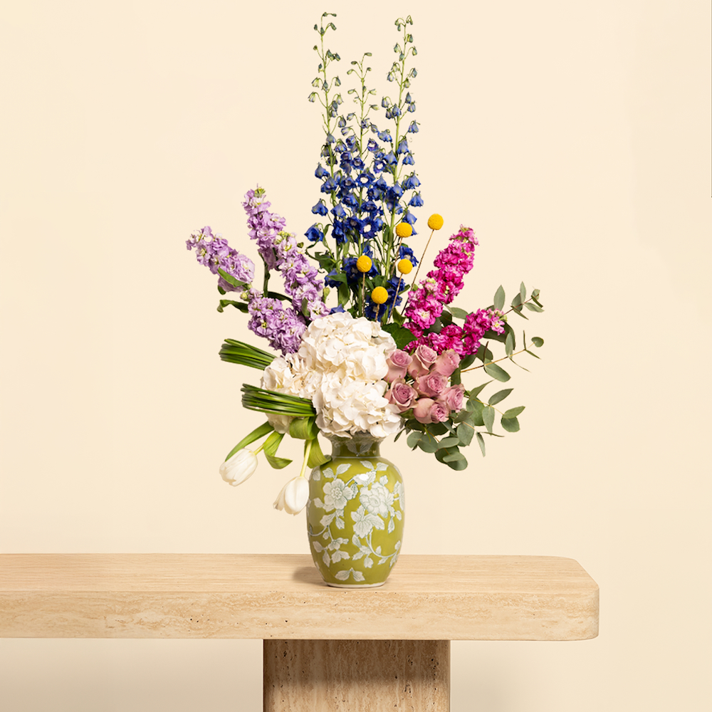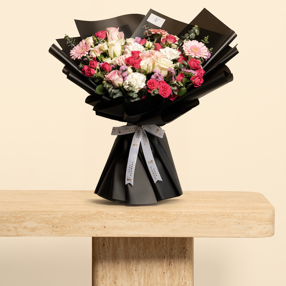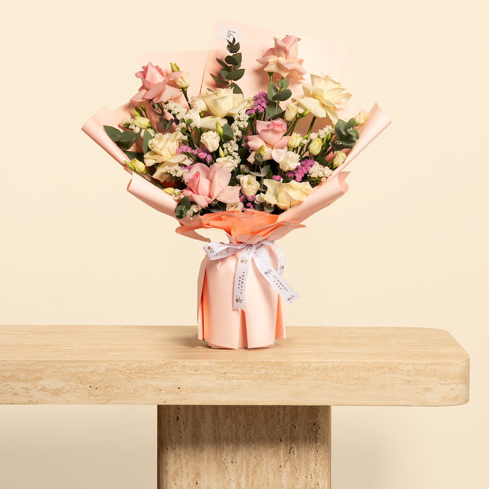 An acrylic box featuring tulips, baby roses and cymbidium flowers with caramel filled chocolates from Hanoverian.