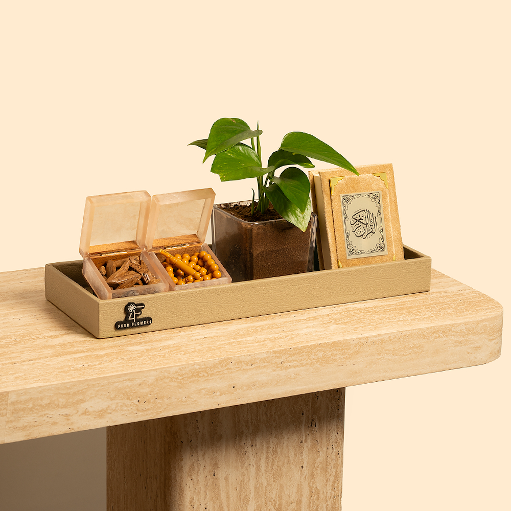 A luxurious beige leather tray featuring: A glass vase with pothos plant. The Holy Quran. 28 grams of high-quality. Moroccan oud with a beautiful fragrance. Bakelite beads in a wooden box with beautiful mother-of-pearl inlay.