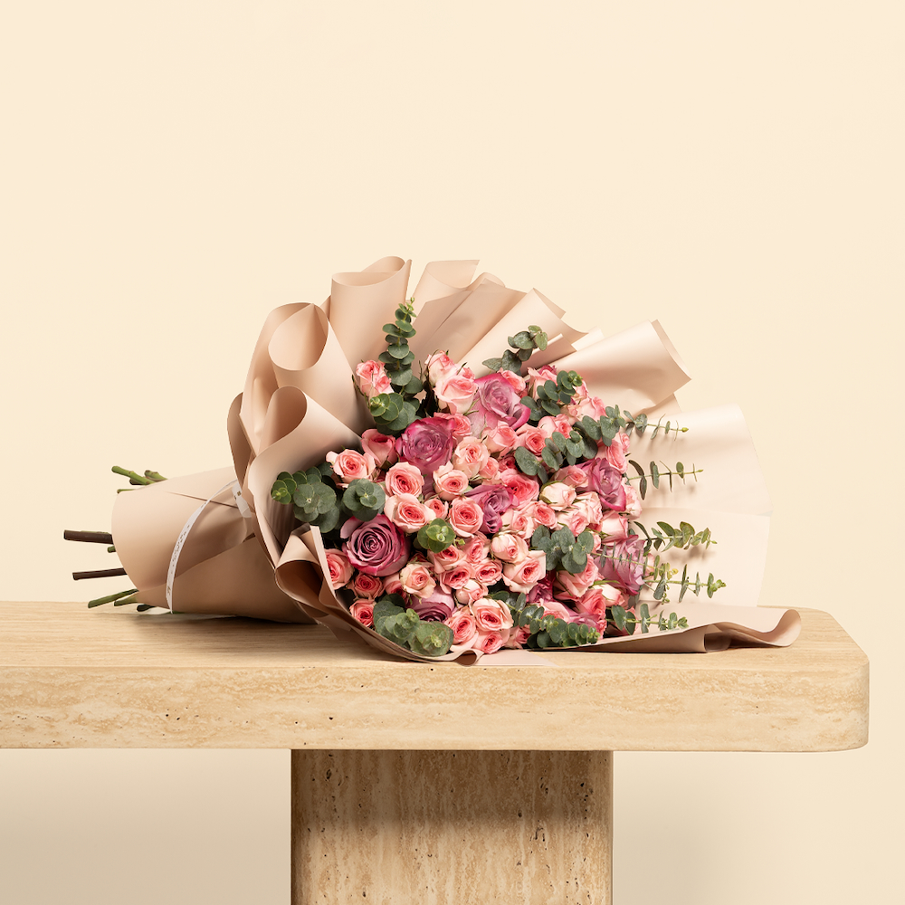 An elegant hand bouquet of roses and baby roses, with soft and elegant packaging.