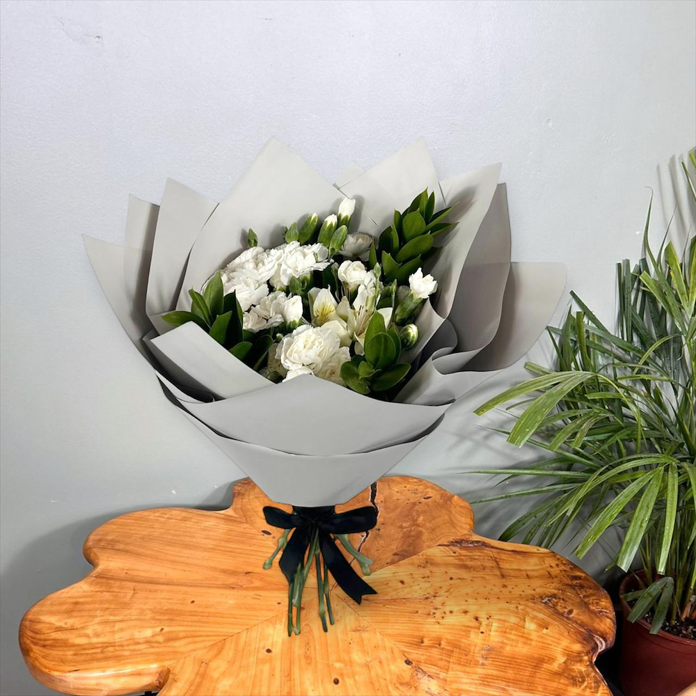 A charming harmony of white roses and alstroemerias, carefully wrapped in elegant gray packaging, offering the perfect balance of beauty and sophistication. Ideal as a gift for a loved one or to add a luxurious touch to your event.
