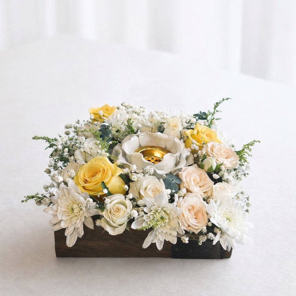 An elegant box featuring roses and chrysanthemums with a mubkhar.