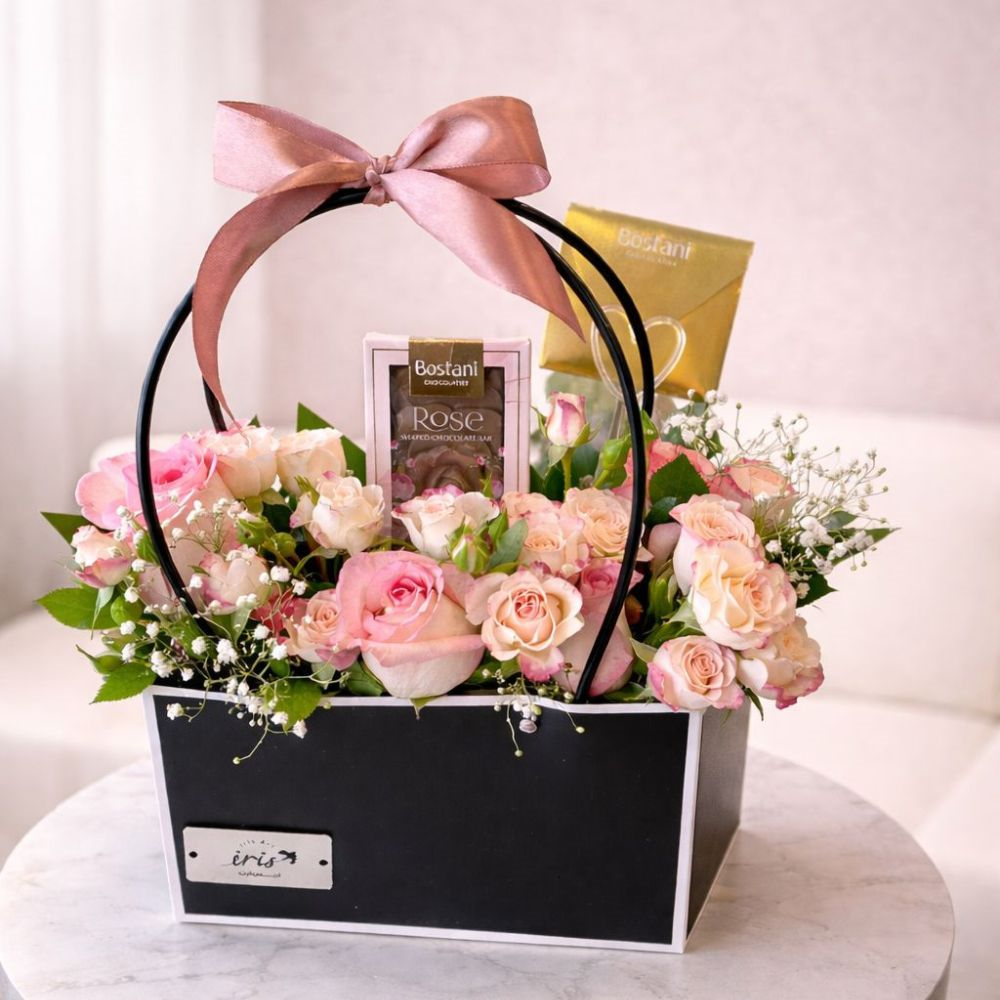 A bag of natural roses in an elegant arrangement with Bostani chocolates and a distinctive card, medium size, suitable for gifting on all occasions, with a sophisticated touch.