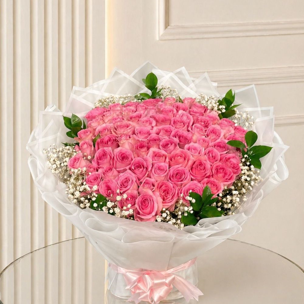 A luxurious bouquet of 60 pink roses, elegantly arranged and wrapped in soft white paper, designed to express love and joy on the most special occasions. Its generous size makes a striking statement and elevates the gift to a truly special place.
