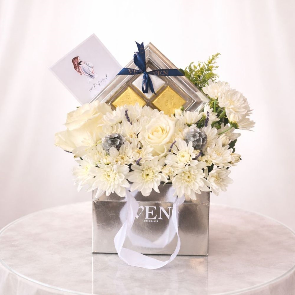 Natural pink bag of flowers with ven signature chocolates (medium size).