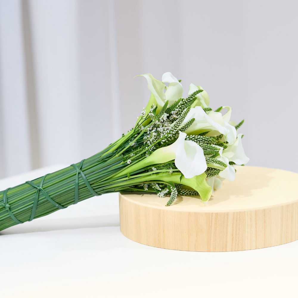 A hand bouquet that contains calla lily.