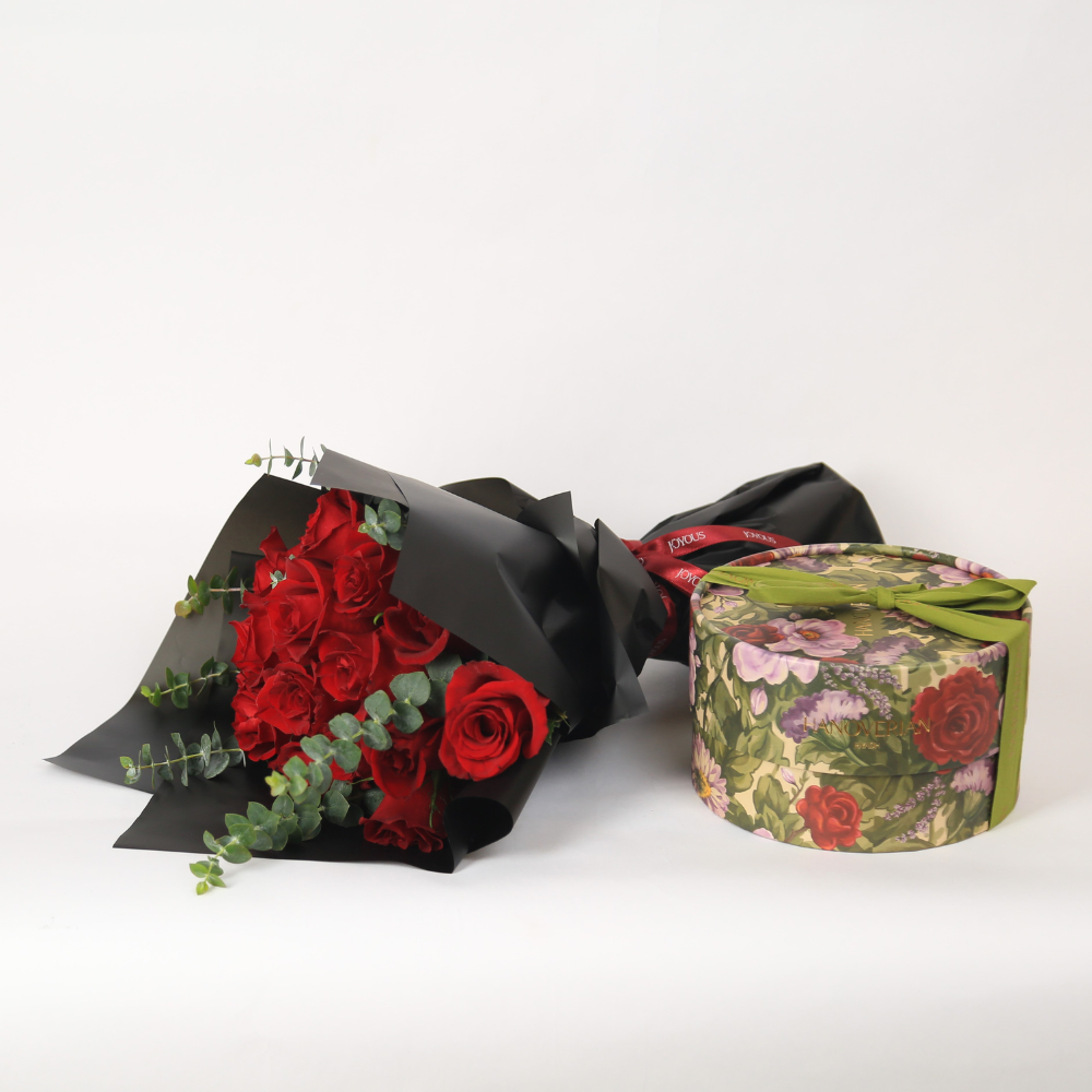 A hand bouquet that contains roses along with chocolates.