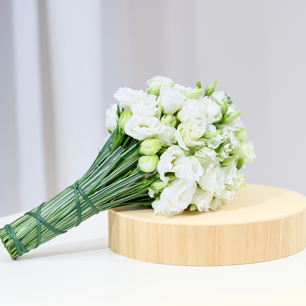 A hand bouquet that contains eustomas.