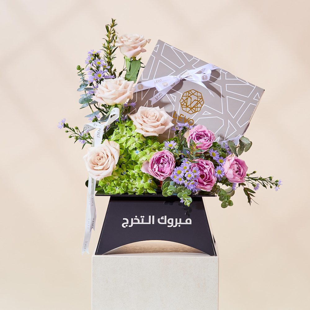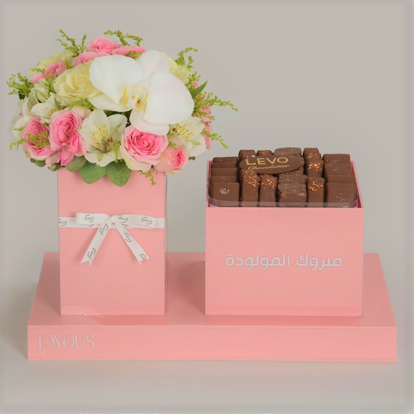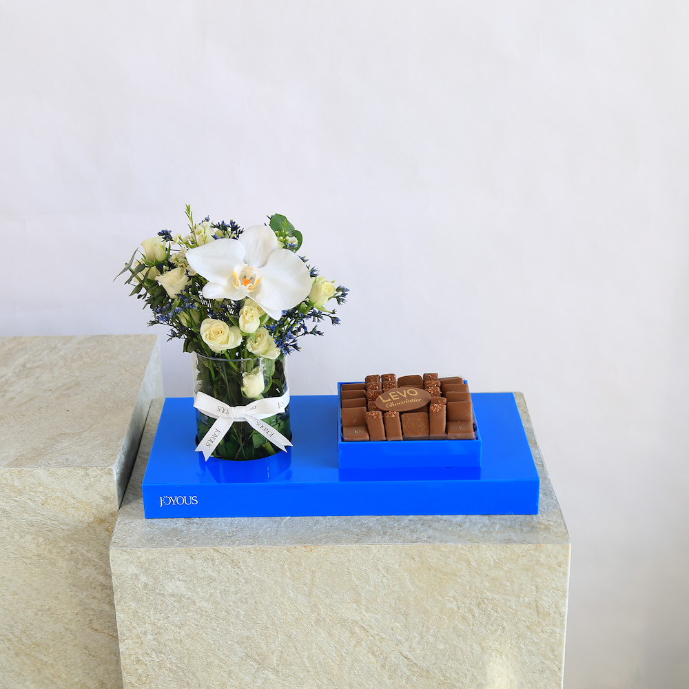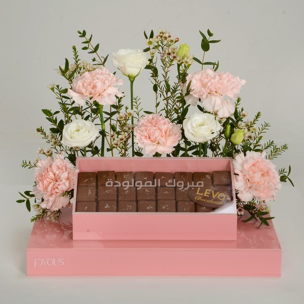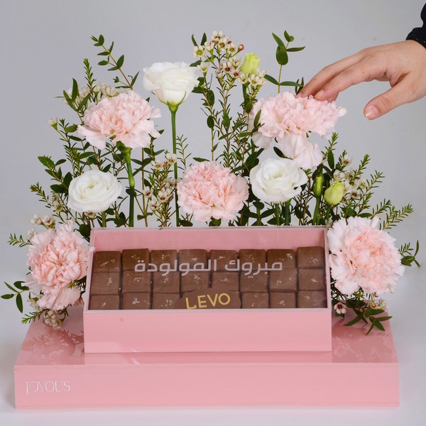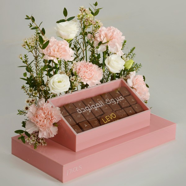 An elegant acrylic tray filled with roses and carnation flowers with 24 pieces of Levo premium chocolates with caramel fudge flavor.