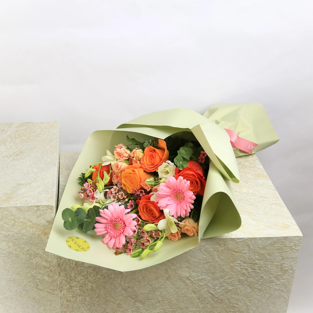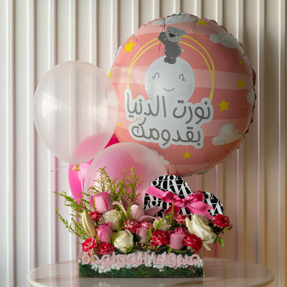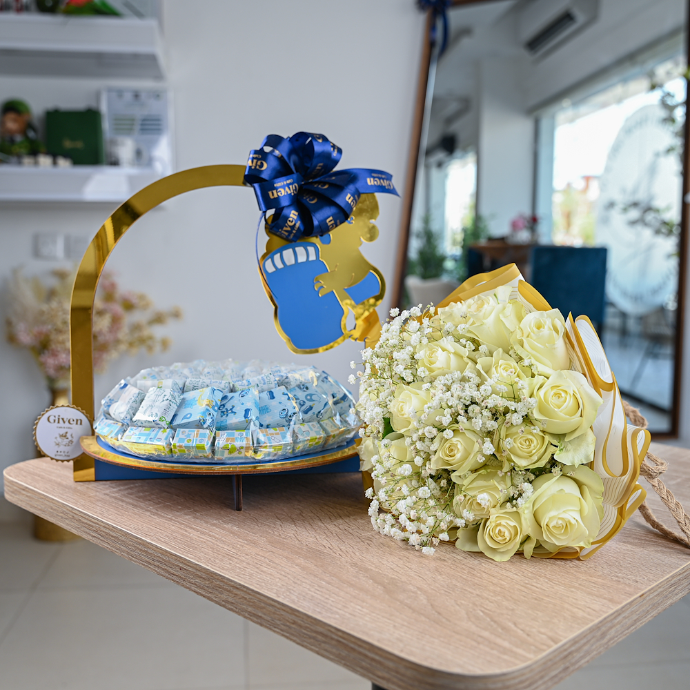 An elegant acrylic tray filled with roses and carnation flowers with 24 pieces of Levo premium chocolates with caramel fudge flavor.